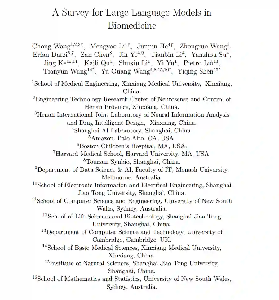 首先,我们探讨了LLM在广泛的生物医学任务中的零样本学习能力,包括诊断辅助、药物发现和个性化医疗等领域,并结合137项关键研究提供了深入见解。接着,我们讨论了LLM的适应策略,包括通过微调方法增强单模态和多模态LLM在特定生物医学背景下的表现,特别是在零样本学习效果不佳的领域,如医学问答和生物医学文献的高效处理。最后,我们分析了LLM在生物医学领域面临的挑战,包括数据隐私问题、模型可解释性有限、数据集质量问题,以及由于生物医学数据的敏感性而带来的伦理问题、对高度可靠模型输出的需求,以及将人工智能应用于医疗领域的伦理影响。