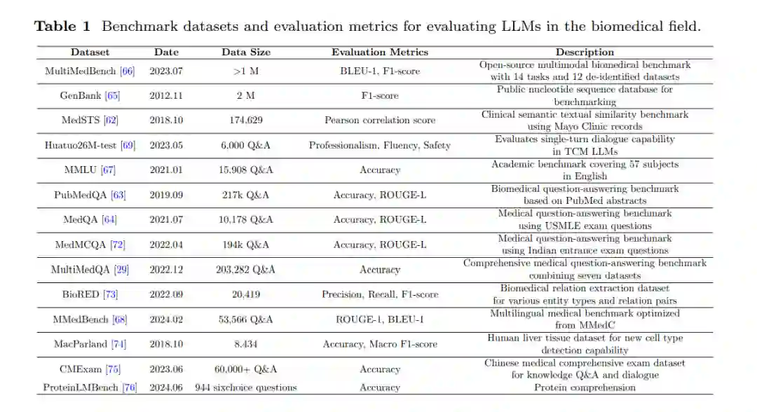 在评估LLM对生物医学问题的表现时,使用了多种基准数据集。表1展示了近期研究中使用的基准数据集。这些数据集涵盖了从基本文本响应到复杂多模态数据的广泛任务。文本数据集如MedSTS[62]、PubMedQA[63]和MedQA[64]专注于评估LLM在语义相似性、问答和内容摘要等生物医学任务中的表现。专门的数据集如GenBank[65]测试LLM处理基因组序列的能力,这对于基因组学和个性化医学中的应用至关重要。多模态基准如MultiMedBench[66]挑战LLM整合和解释来自多个来源的数据,如医学图像和随附的文本描述,反映了医学诊断的复杂性。用于评估模型在不同任务中表现的常用指标包括准确率、BLEU-1、F1评分和ROUGE-L[65, 67, 68]。在评估LLM在生物医学对话场景中的表现时,开发了专业性、流畅性和安全性等特定指标,以捕捉生物医学交流的细微要求[69-71]。