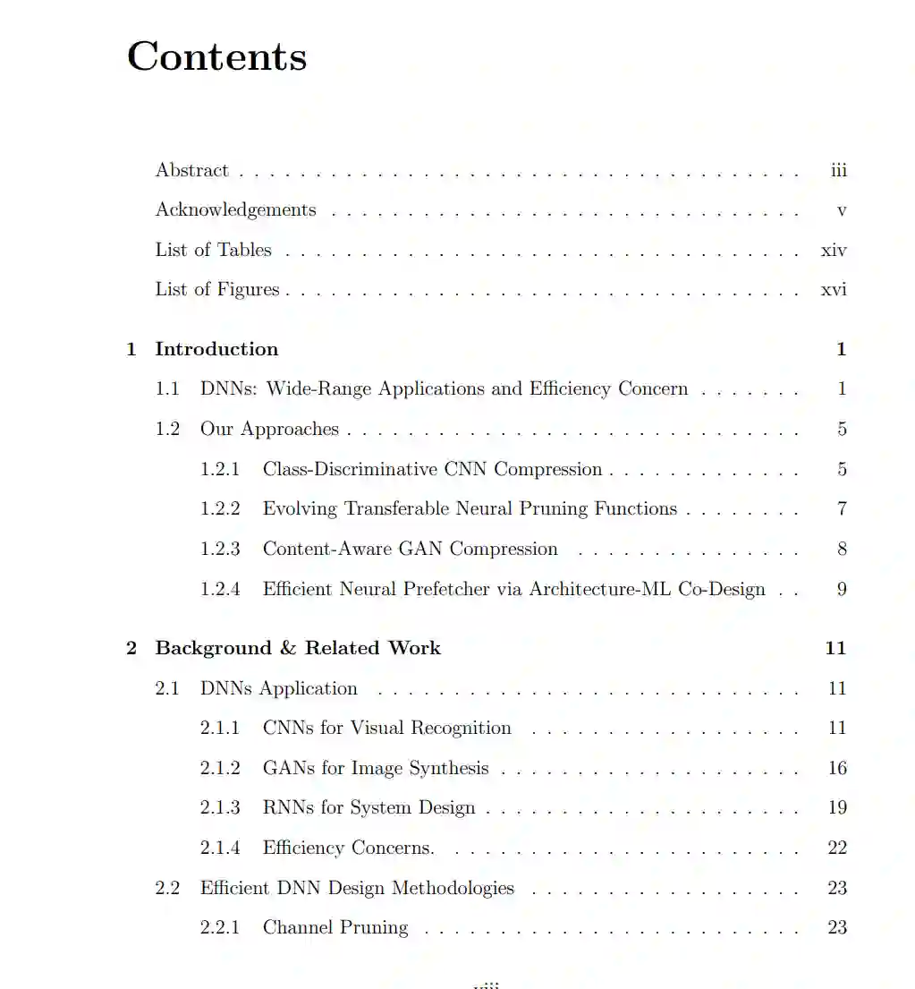 本文通过一个简单而直观而有效的概念,解决了不同领域的深度神经网络高效设计的挑战:深度神经网络本身是为不同的学习目标定制的,提高其效率的方法也应该是定制的。有了这个概念,本文提出设计高效CNN、GANs和RNN的方法。本文首先提出了一种CNN压缩算法——类判别压缩(CDC),与CNN的类判别训练目标无缝契合,并在不损失精度的情况下为ImageNet上的ResNet50提供了1.8倍的加速。对CNN压缩的通道剪枝进行了深入研究。在分类精度目标的驱动下,本文提出一种进化框架,以自动发现优于手动设计的可迁移剪枝函数。本文进一步研究了GAN图像合成的另一种应用。GAN被训练成合成真实的内容,从而提出了一种内容感知的GAN压缩方法,将最先进的模型加速了11倍,而图像质量损失可以忽略不计。最后,我们将研究扩展到系统设计领域,我们的目标是通过构建高效的RNN数据预取器来缓解内存墙。本文提出一种多架构协同设计策略,将最先进的神经预取器速度提高15倍,性能甚至更好。