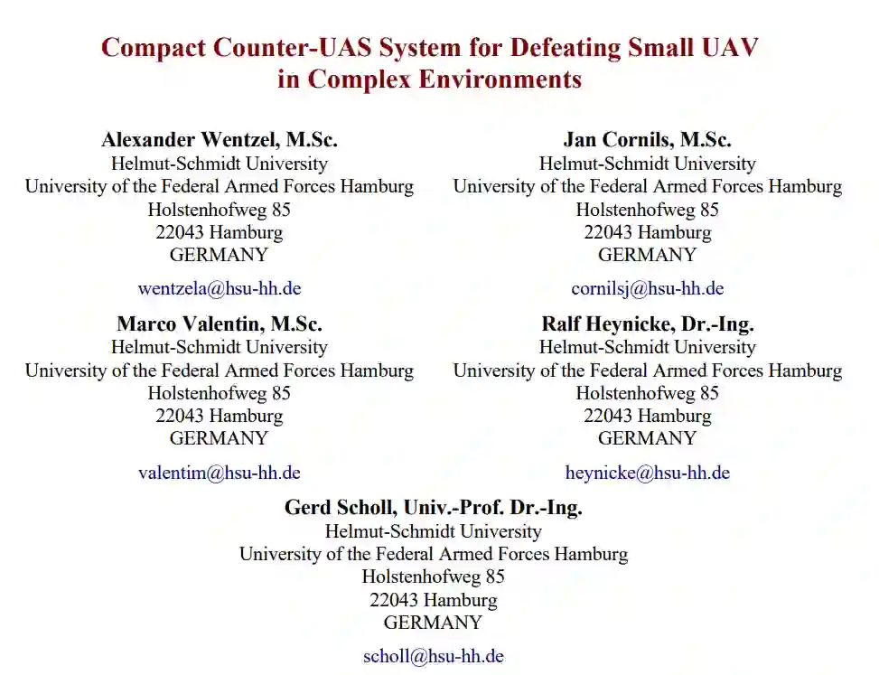 本文介绍的 cUAS 是一种全自动、多功能、可移动部署的系统,能够利用气压驱动的网状发射器拦截市场上几乎所有的小型无人机。与上述替代方案相比,所开发的 cUAS 不受未经授权的小型无人机操作模式的影响,即手动或自动控制,甚至不受全球导航卫星系统或射频的影响。我们的多传感器方法(照相机、激光雷达和雷达传感器)以及所实施的算法使 cUAS 能够在各种环境下运行,如开放式机场、军用场地和城市空间,在这些环境下,许多雷达反射通常会阻碍对小型物体的探测和跟踪。cUAS 可独立接近、跟踪和/或拦截速度高达 20 米/秒的已识别无人机,成功率超过 90%。