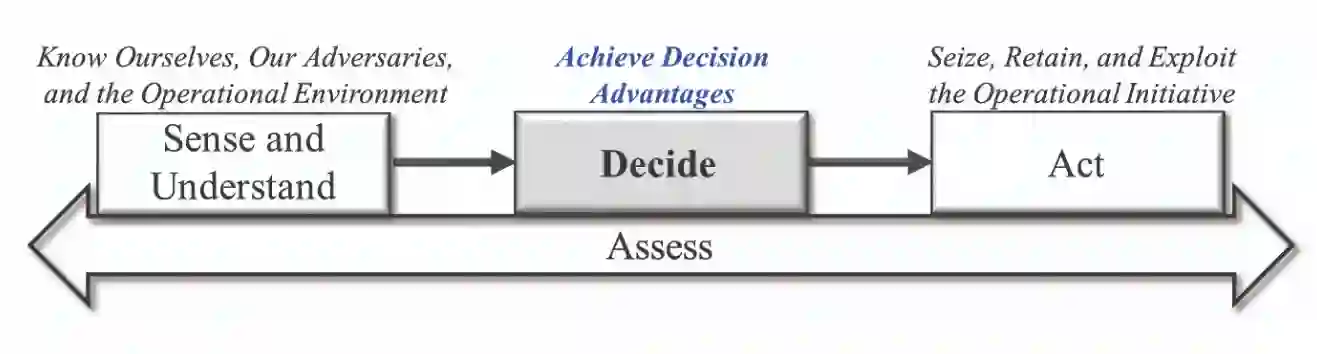正如所描述的那样,陆军的方法使用了作战过程,特别是指挥官在作战过程中的作用(理解、可视化、描述、指导、领导和评估,或称UVDDLA),来描述这个决策周期。正如ADP 5-0《作战过程》所概述的,作战过程是指挥和控制的框架,指挥官的核心作用是 "推动必要的概念和详细规划,以了解他们的作战环境;可视化并描述行动的最终状态和作战方法;做出并阐明决策;指导、领导和评估行动";这可以从图4看出。重要的是,ADP 5-0指出,"行动过程的目标是做出及时和有效的决定,并比敌人更快地采取行动"。然而,在行动过程中使用UVDDLA作为信息优势的框架是有缺陷的,原因有几个。首先,最重要的是,虽然作战过程的核心是做决定,但作战过程本身并没有对决策如何发生给出额外的见解。因此,在图3中,与作战功能的联系并不明显,因为这些功能要么加强了决策周期,要么降低了决策周期。图中显示了作战功能的作用,但却没有说明如何发挥这一作用。最后,与其他决策框架不同,作战过程直接与陆军的指挥和控制方法联系在一起。这种缺乏通用性的情况意味着它没有灵活性,不能照搬和应用于理解对手的决策过程。应该指出的是,在决策主导权定义的早期迭代中,作战过程并不是用来描述决策过程的。詹姆斯-麦康威尔将军在他的参谋长一号文件中指出,"决策主导权是一种理想状态,在这种状态下,指挥官比对手更快、更有效地感知、理解、决定、行动和评估[SUDAA]。" 这种SUDAA过程在陆军未来司令部关于决策主导权的小册子中得到了形象的描述,见图5。使用这个定义比使用行动过程有几个好处。首先,信息在做出更有效的决策中的作用很容易被应用到这个过程的 "感觉和理解 "部分。第二,虽然这个过程本身是由指挥官在指挥和控制过程中使用的,但SUDAA过程却没有那么严格地只与指挥官联系在一起。