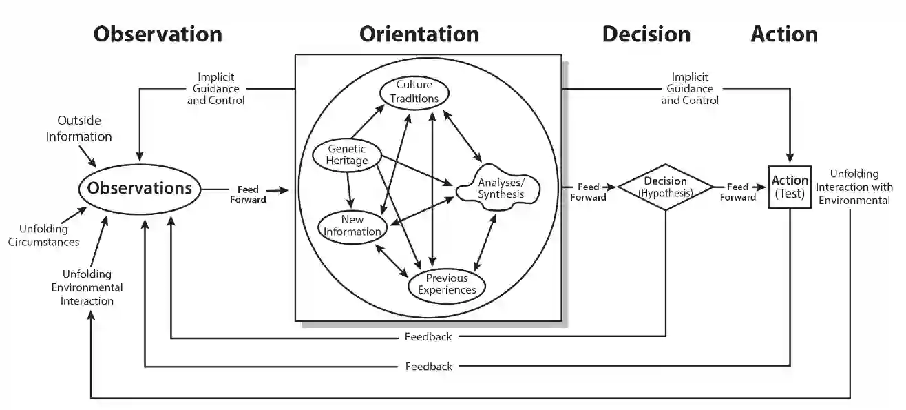 尽管有了这些对行动过程的改进,SUDAA的理念仍然没有得到完善。然而,它显然受到了另一个决策框架的启发,这个框架更加成熟,也可以应用于整个作战职能和所有组织层面,即由退役的约翰-博伊德上校创建的方向-观察-决定-行动(OODA)循环。