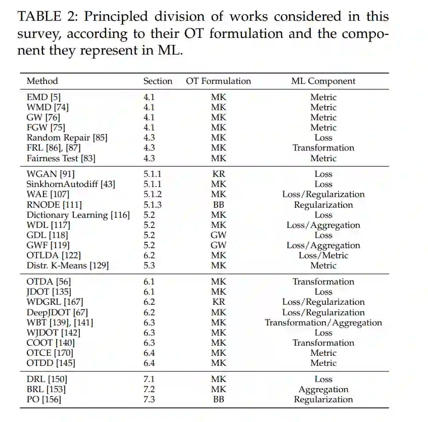 在介绍OT在ML方面的最新贡献之前,我们简要回顾了与相关主题有关的先前综述。关于OT作为数学领域,有大量的文献可供参考。例如,[12]和[13]从连续的角度介绍OT理论。该领域最完整的文本仍然是[3],但它远非入门文本。正如我们在本调查中介绍的,OT为ML做出的贡献在本质上是计算性的。在这个意义上,从业者将专注于离散公式和如何实施OT的计算方面。这是[9]和[10]这两篇调查的情况。虽然[9]作为OT及其离散公式的介绍,[10]则提供了更广泛的视角,介绍了OT的计算方法以及它如何广泛应用于数据科学。在OT为ML方面,我们将我们的工作与[7]和[11]进行比较。前者介绍了OT的理论,并简要讨论了OT在信号处理和ML(如图像去噪)中的应用。后者提供了OT为ML贡献的广泛领域的概述,按数据的结构分类(即,直方图,经验分布,图表)。