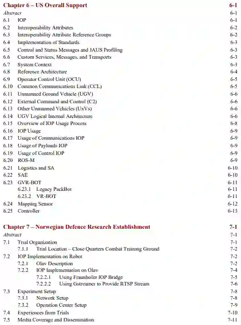 本报告描述了北约STO RTG IST-149无人地面系统和C2内互操作性能力概念演示器的研究和实验工作。无人地面车辆(UGVs)在现代战斗空间中正变得越来越重要。这些系统可以携带大量的传感器套件,从前线提供前所未有的数据流。另一方面,这些系统在大多数情况下仍然需要远程操作。重要的是要认识到,如果没有适当的方式在联盟伙伴之间交换信息和/或将其纳入C2系统,ISR数据在很大程度上将是无用的。该小组的主要目的是找到改善这种情况的方法,更具体地说,调查从操作员控制单元(OCU)控制UGV和接收数据的可能标准,并在现实世界的场景中测试它们。