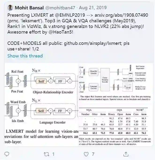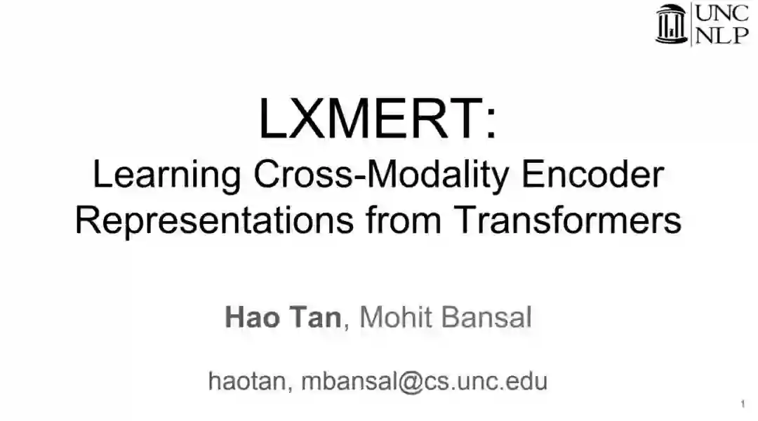 视觉和语言推理需要理解视觉概念、语言语义,最重要的是理解这两种模式之间的对齐和关系。因此,我们提出了LXMERT(从Transformers中学习跨模态编码器表示)框架来学习这些视觉和语言联系。在LXMERT中,我们构建了一个大型Transformers模型,它由三个编码器组成:一个对象关系编码器、一个语言编码器和一个跨模态编码器。接下来, 赋予我们的模型的功能连接视觉和语言的语义,我们在大量image-and-sentence 预训练模型, 通过五个不同代表训练的任务: mask语言建模,mask对象预测(功能回归和标签分类), 跨模式匹配和图像问答。这些任务有助于学习模态内和模态间的关系。从我们预先训练的参数进行微调后,我们的模型在两个可视化的问题回答数据集(即, VQA和GQA)。我们还通过将预训练的跨模态模型应用于具有挑战性的视觉推理任务NLVR2,并将之前的最佳结果提高了22%(54%至76%),从而展示了该模型的通用性。最后,我们展示了详细的ablation study,以证明我们的新模型组件和预训练策略对我们的结果有显著的贡献;并针对不同的编码器提出了几种注意可视化方法。代码和预训练的模型可在: https://github.com/airsplay/lxmert