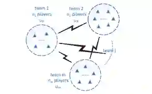 图1. 一个具有同时或连续行动、完全或不完全信息、对称或不对称信息的对抗博弈的一般框架,其中三角形表示玩家,存在m个团队,在团队内部,团队成员以合作方式进行博弈,而团队之间的博弈是对抗性的,通常是零和,即 为所有策略,下标ij代表第i队中的第j个玩家,其策略和效用函数分别表示为