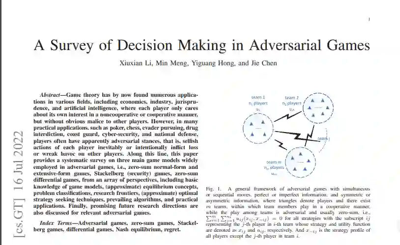 到目前为止,博弈论已经在各个领域形成了大量应用,包括经济学、工业、法学和人工智能,其中每个玩家只关心自己的利益,以非合作或合作的方式,但对其他玩家没有明显恶意。然而,在很多实际应用中,如扑克、国际象棋、追逃、缉毒、海岸警卫队、网络安全和国防等,玩家往往有明显的敌对立场,即每个玩家的自私行为不可避免地或有意地对其他玩家造成损失或破坏。按照这一思路,本文从一系列角度对对抗性博弈中广泛采用的三种主要博弈模型,即零和范式和广泛形式博弈、斯塔尔伯格博弈(安全)博弈、零和微分博弈进行了系统的调查,包括博弈模型的基本知识、(近似)均衡概念、问题分类、研究前沿、(近似)最优策略寻求技术、流行算法和实际应用。最后,还讨论了相关对抗性博弈的未来研究方向。