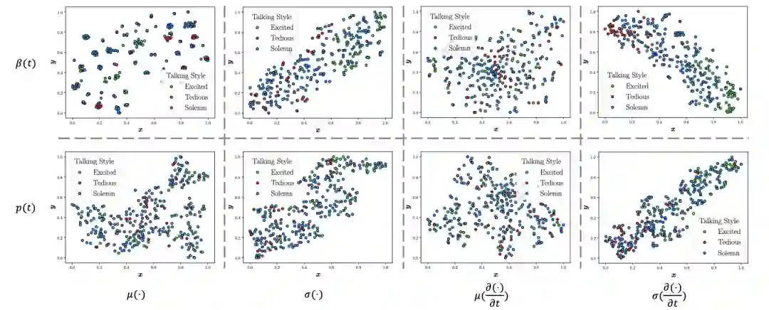 为了找到这样一个统计量,我们做了大量的statistical study,发现风格与表情序列的方差、表情序列差分的方差,姿态序列差分的方差密切相关。因此我们将控制风格的连续性统计量定义如下: