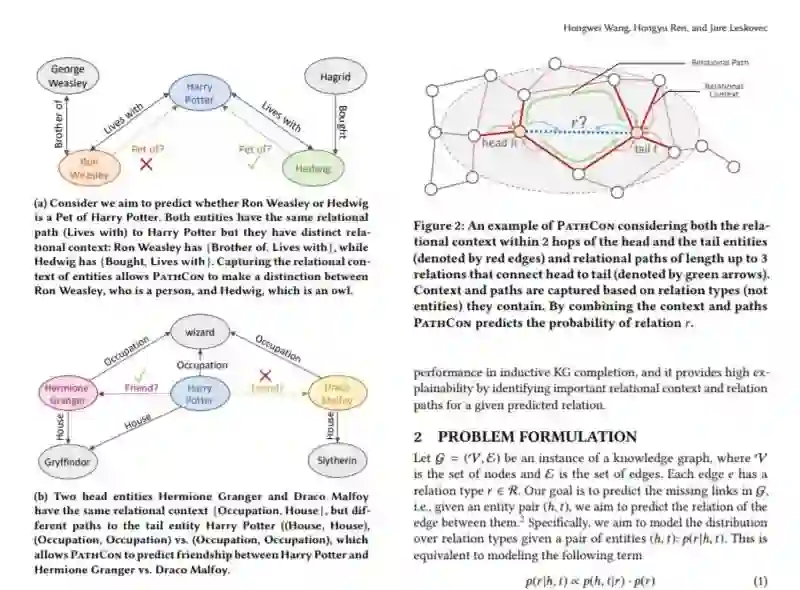 知识图谱补全的目的是预测知识图谱中实体之间的缺失关系。虽然已经提出了许多不同的方法,但缺乏一个统一的框架产生SOTA的结果。在这里,我们开发了PathCon,这是一种知识图谱补全方法,它利用四个新颖的见解来超越现有的方法。PathCon通过以下方法预测一对实体之间的关系: (1)通过捕获实体附近的关系类型,并通过基于边缘的消息传递模式建模,来考虑每个实体的关系上下文; (2)考虑获取两个实体之间所有路径的关系路径; (3)通过可学习的注意力机制,自适应地整合关系上下文和关系路径。重要的是,与传统的基于节点的表示不同,PathCon仅使用关系类型表示上下文和路径,这使得它适用于归纳设置。在知识图谱基准上的实验结果以及我们新提出的数据集表明,PathCon在很大程度上优于最先进的知识图谱补全方法。最后,PathCon能够通过识别对给定的预测关系很重要的上下文和路径关系来提供可解释的说明。