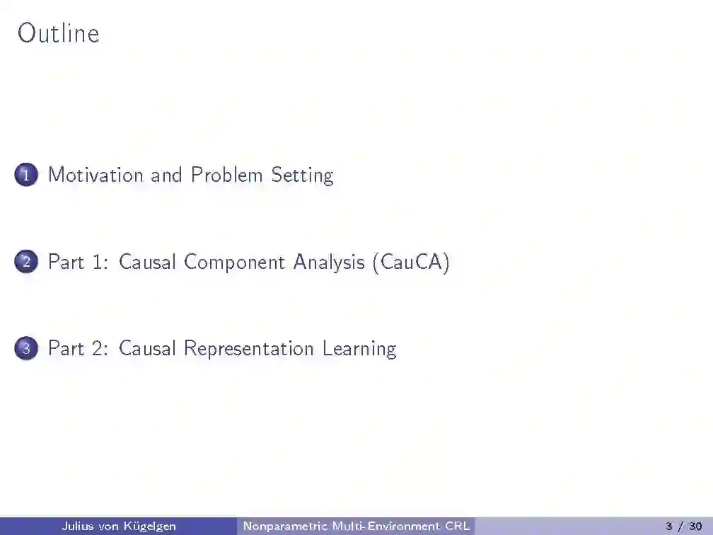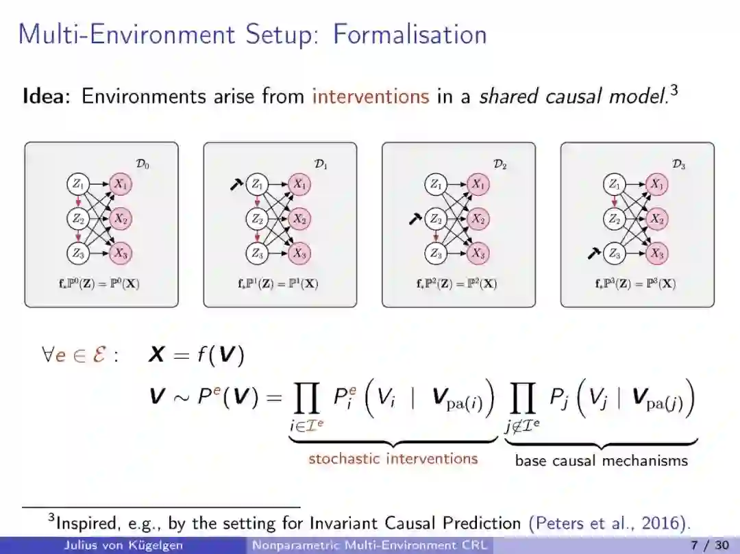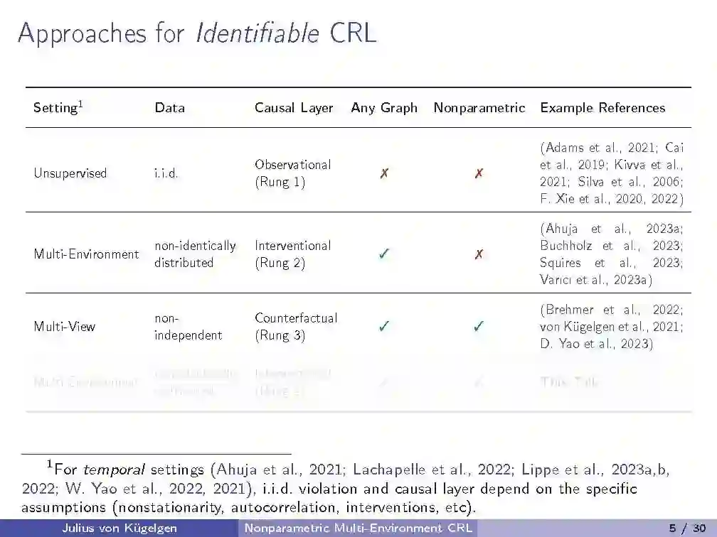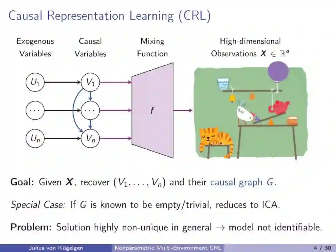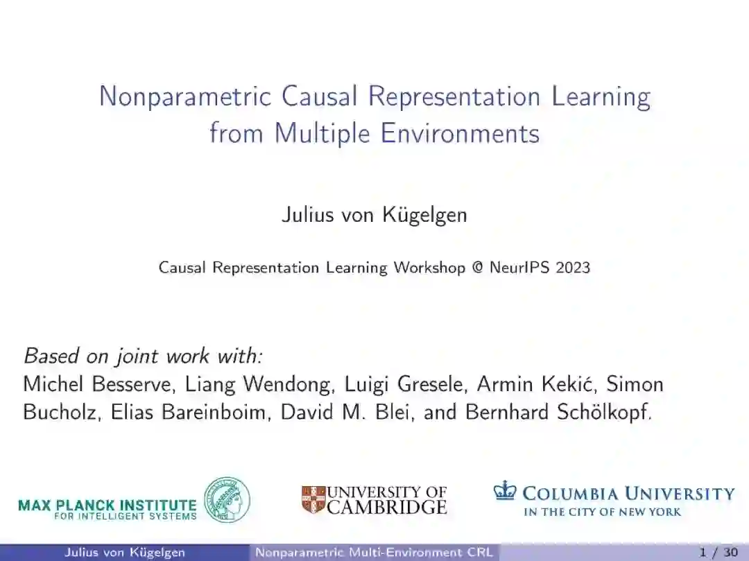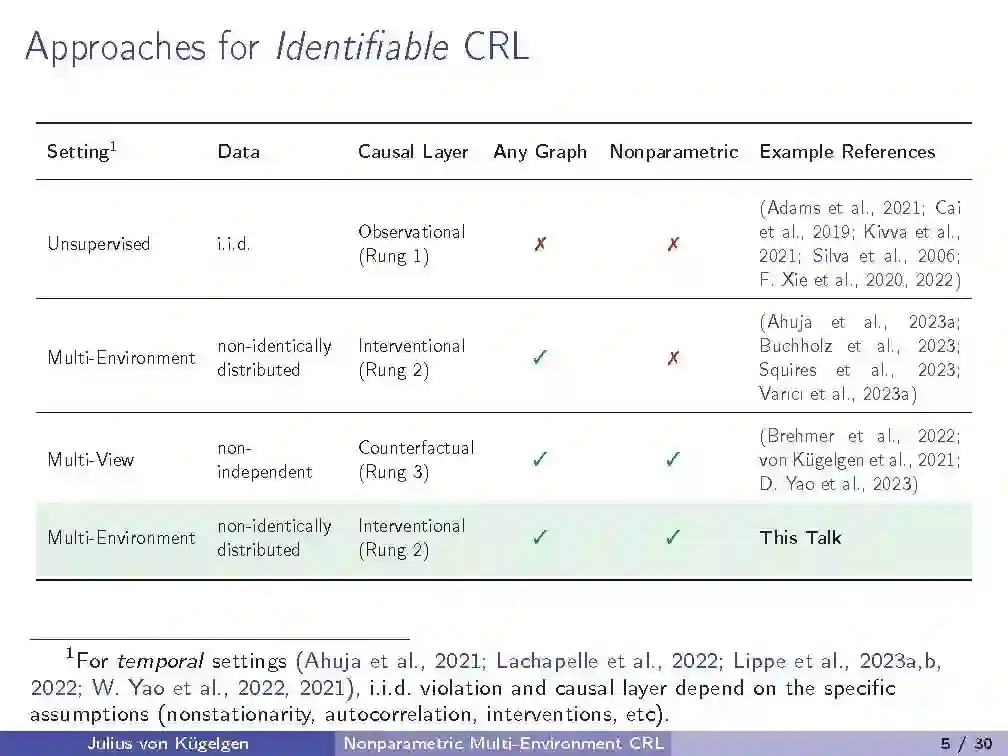 我们研究因果表示学习,即从高维变量混合中推断潜在因果变量及其因果关系的任务。先前的工作依赖于弱监督,以反事实干预前后视图或时间结构的形式;对混合函数或潜在因果模型提出限制性假设,如线性;或需要对生成过程有部分知识,如因果图或干预目标。相反,我们考虑一个一般性设置,在该设置中,因果模型和混合函数都是非参数的。学习信号采取多个数据集或环境的形式,这些数据集或环境源于潜在因果模型中未知干预的结果。我们的目标是识别出基本真实的潜在因素及其因果图,直到一组我们证明无法从干预数据解决的模糊性。我们研究了两个因果变量的基本设置,并证明观测分布和每个节点一个完美干预就足以确定性识别,前提是一个通用性条件。该条件排除了涉及干预和观测分布的微调的伪解,反映了类似于非线性因果-效应推断的相似条件。对于任意数量的变量,我们显示每个节点至少一对不同的完美干预领域保证了确定性识别。此外,我们展示了所有等效解决方案保留了潜在变量间因果影响的强度,使得推断出的表示适合从新数据中得出因果结论。我们的研究为带有未知干预的一般非参数设置提供了首个确定性识别结果,并阐明了在没有更直接监督的情况下,因果表示学习可能与不可能的事项。