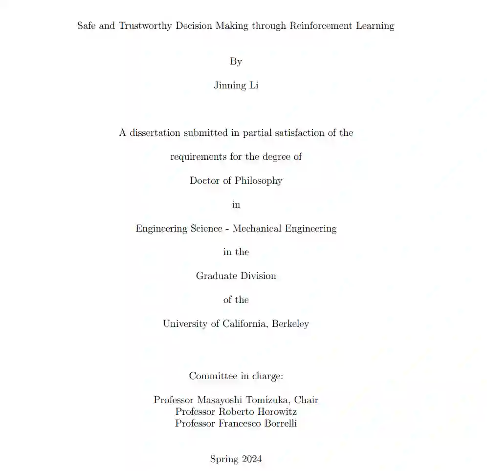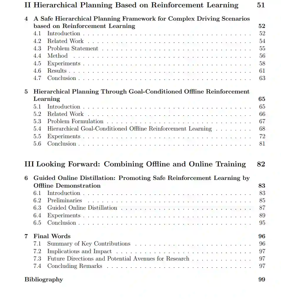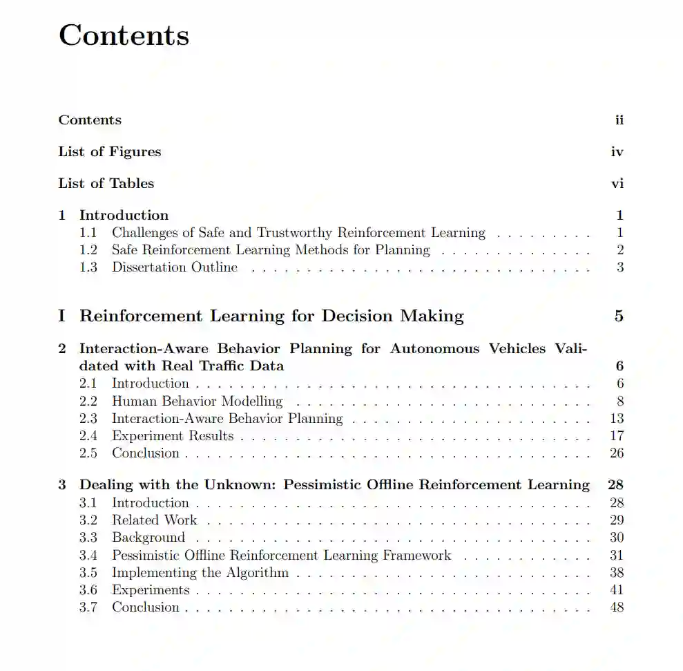 随着先进计算技术和人工智能的快速发展,复杂系统和应用程序迎来了新纪元,尤其是在自动驾驶汽车(AV)和机器人领域。这些系统越来越多地需要在动态和不确定的环境中自主决策。强化学习(RL)在这一背景下成为了关键技术,为通过与环境互动来学习最优决策策略提供了框架。然而,确保这些决策的安全性和可信性仍然是一个重要的挑战,特别是在安全至关重要的应用场景中,如自动驾驶。本论文针对这一挑战,提出了创新的基于RL的方法,结构分为三个既独立又相互关联的部分,每一部分都专注于安全且可信决策制定中的不同方面。论文的主线是探索和改进RL技术,以确保自主决策系统在复杂、动态环境下的安全性和可靠性。首先,本论文奠定了RL在决策制定中的基础,特别是在不确定和动态的环境下。该部分聚焦于增强RL,以应对现实世界的复杂性,例如在自动驾驶场景中与不可预测的代理(如人类驾驶员)互动,以及在离线RL设置中处理分布偏移问题。这为理解和提升自主系统在不确定条件下的决策能力奠定了基础。在第一部分的基础上,第二部分探讨了层次化规划与RL的集成。该部分重点在于创建一种框架,将不同层次的决策制定相结合,平衡即时的低层次安全问题与高层次战略目标。该方法旨在应对传统RL在复杂多代理环境和长时间任务中的局限性,从而在实时决策中展示出更好的适应性和效率。第三部分则呈现了对RL的前瞻性方法,重点在于离线和在线学习方法的整合。这一部分解决了在探索可能代价高昂或危险的场景中,安全有效地训练RL代理的问题。通过将大规模离线数据(如专家示范)的优势与在线学习相结合,本部分提出了一个新的框架,以增强RL代理在实际应用中的安全性和性能。