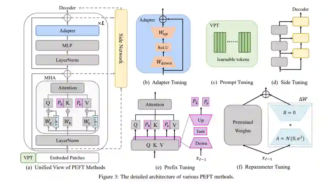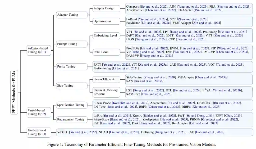 随着可用数据集[Deng 及其他人,2009]、模型架构[Dosovitskiy 及其他人,2021]和训练算法[He 及其他人,2022]的发展,大量的视觉基础模型得到了开发。特别是,基于Transformer的预训练视觉模型(PVMs)[Khan 及其他人,2022]在各种计算机视觉任务中展现了卓越的性能,例如图像分类[Dosovitskiy 及其他人,2021]和语义分割[Kirillov 及其他人,2023]。 由于PVMs的强大表示能力,微调PVMs以学习下游任务已成为一种流行的范式。然而,尽管传统的完全微调有效,但它需要大量的计算和存储资源。对于拥有数十亿甚至数万亿参数的模型来说,这种做法尤其昂贵。此外,还需要为每个数据集维护单独的模型权重,随着任务数量的增加,特别是在大型PVMs的情况下,这变得不切实际。 作为一种有前景的解决方案,最初在NLP中提出的参数高效微调(PEFT)通过更新最少数量的参数来克服上述挑战,同时可能实现与完全微调相当或更优的性能[Hu 及其他人,2021; Yu 及其他人,2022]。这些方法依赖于最近的进展,表明用丰富数据训练的大型预训练模型具有强大的泛化能力,PVMs中的大多数参数可以为新任务共享[Kornblith 及其他人,2019; Yu 及其他人,2022]。PEFT方法可以减少可学习的参数,这不仅促进了对新任务的更有效适应,而且还保护了PVMs内部的预存知识。考虑到PEFT的前景和大规模视觉模型的快速发展,迫切需要一项提供PEFT在视觉领域详细和最新调查的综述。 本文旨在提供一项关于视觉领域PEFT方法的全面和系统的研究,特别关注从2019年到2023年的基于Transformer的预训练模型。如图1所示,现有的视觉PEFT方法可以分为基于添加的调整、基于部分的调整和基于统一的调整。在第2部分,我们将定义PEFT的问题,介绍流行的主干网络,并讨论预训练方法。在第3部分,将提出PEFT方法的详细分类和深入分析。第4部分将介绍PEFT的实际应用。最后,在第5部分,我们将指出未来研究的挑战。