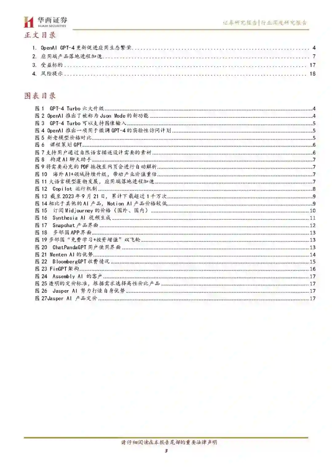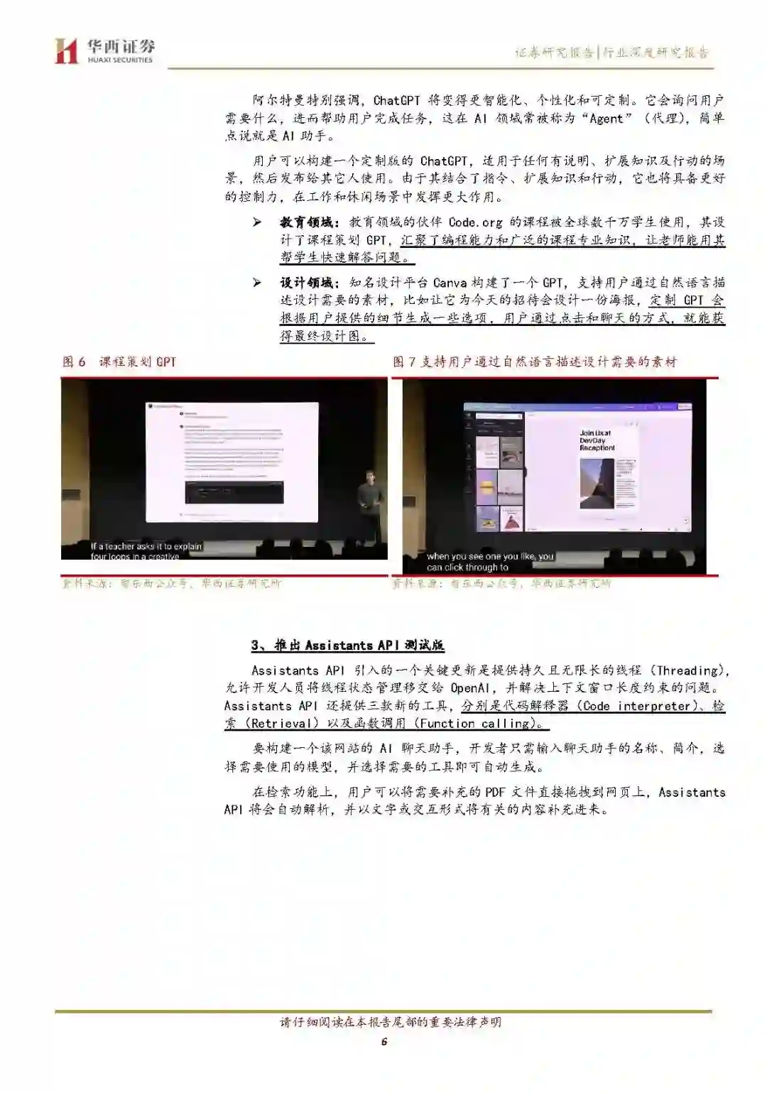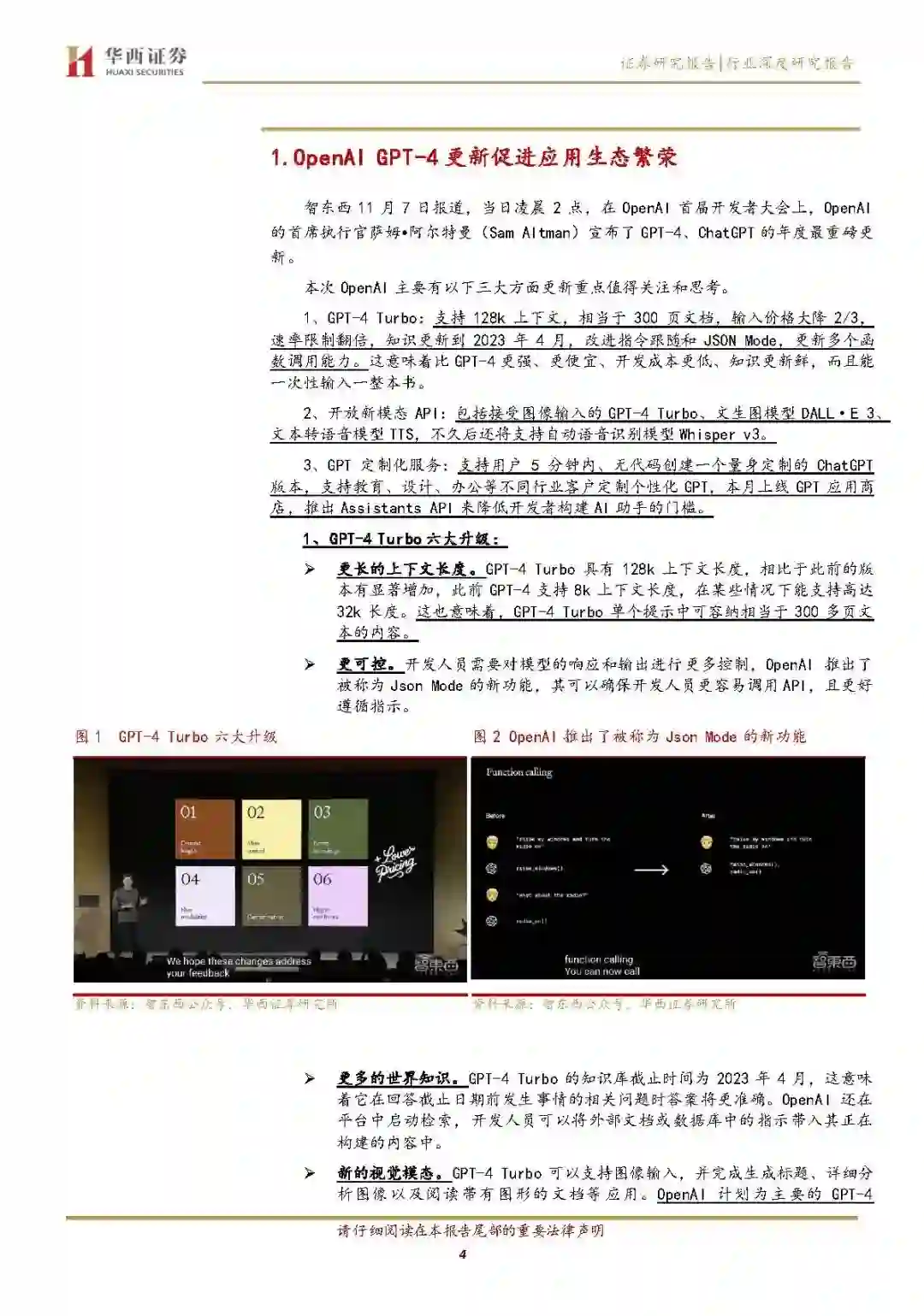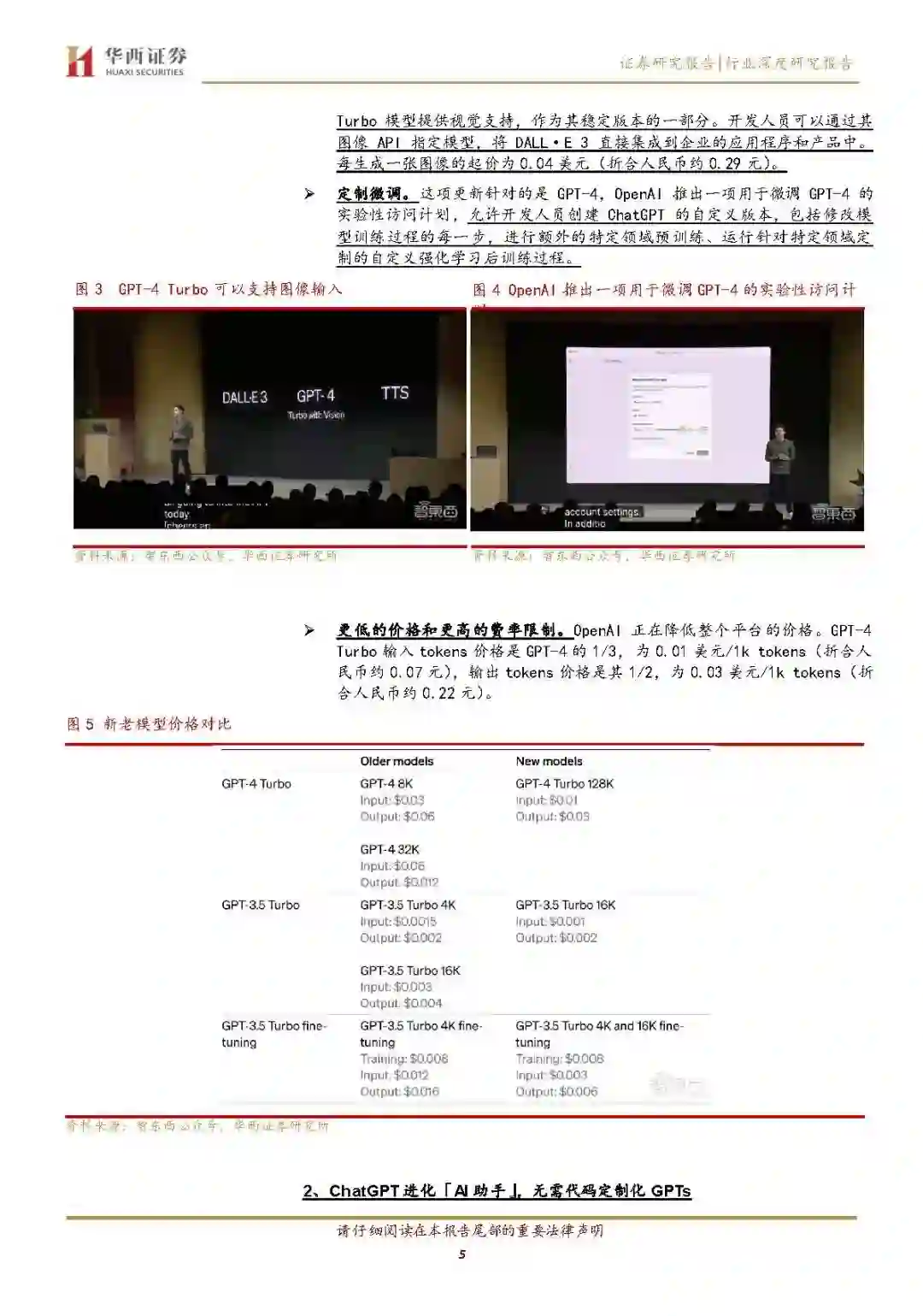OpenAIGPT-4 更新促进应用生态繁荣 本次大会主要亮点:1、GPT-4Turbo:支持128k上下文,相当于300页文档,输入价格大降2/3,速率限制翻倍,知识更新到2023年4月,改进指令跟随和JSONMode,更新多个函数调用能力。这意味着比GPT-4更强、更便宜、开发成本更低、知识更新鲜,而且能一次性输入一整本书。2、开放新模态API:包括接受图像输入的GPT-4Turbo、文生图模型DALL·E3、文本转语音模型TTS,不久后还将支持自动语音识别模型Whisperv3。3、GPT定制化服务:支持用户5分钟内、无代码创建一个量身定制的ChatGPT版本,支持教育、设计、办公等不同行业客户定制个性化GPT,本月上线GPT应用商店,推出AssistantsAPI来降低开发者构建AI助手的门槛。我们认为此次OpenAI的更新在降低模型开发难度和成本上更进一步,同时进一步促进下游应用生态繁荣,对标海外,我们认为国内有望紧跟技术趋势,加速模型更定迭代,逐步探索更多B端合C端应用场景,商业化落地节奏有望逐步清晰。