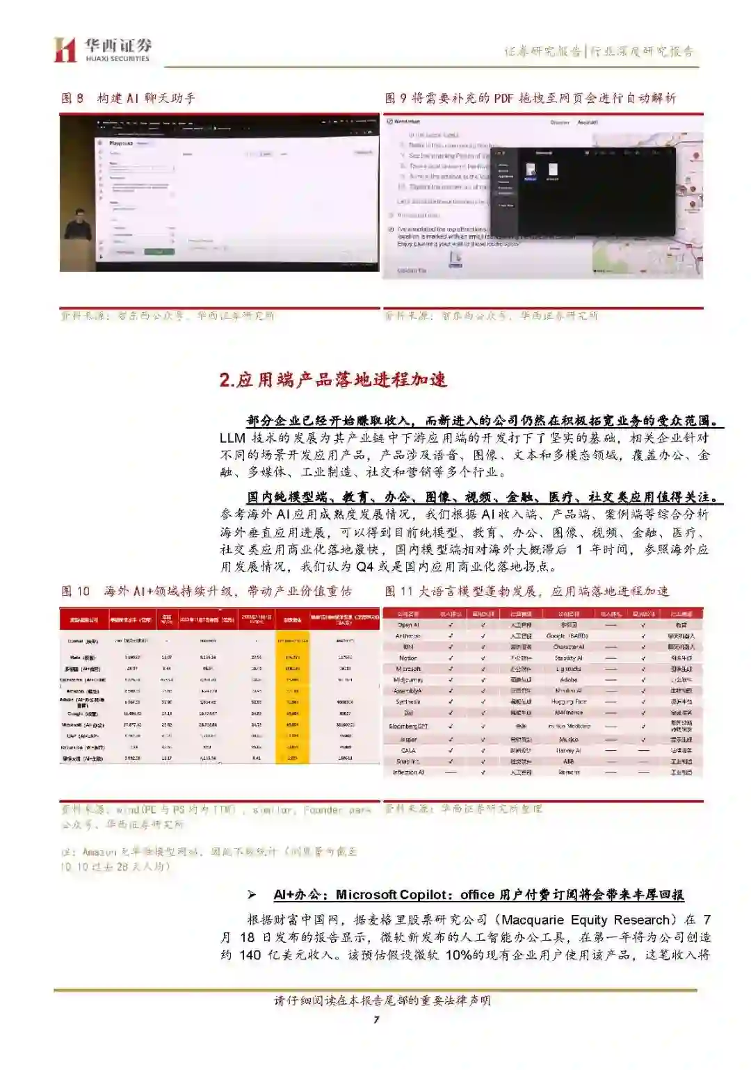 应用端产品落地进程加速,相关赛道值得关注 部分企业已经开始赚取收入,而新进入的公司仍然在积极拓宽业务的受众范围。LLM技术的发展为其产业链中下游应用端的开发打下了坚实的基础,相关企业针对不同的场景开发应用产品,产品涉及语音、图像、文本和多模态领域,覆盖办公、金融、多媒体、工业制造、社交和营销等多个行业。 国内纯模型端、教育、办公、图像、视频、金融、医疗、社交类应用值得关注。参考海外AI应用成熟度发展情况,我们根据AI收入端、产品端、案例端等综合分析海外垂直应用进展,可以得到目前纯模型、教育、办公、图像、视频、金融、医疗、社交类应用商业化落地最快,国内模型端相对海外大概滞后1年时间,参照海外应用发展情况,我们认为Q4或是国内应用商业化落地拐点。