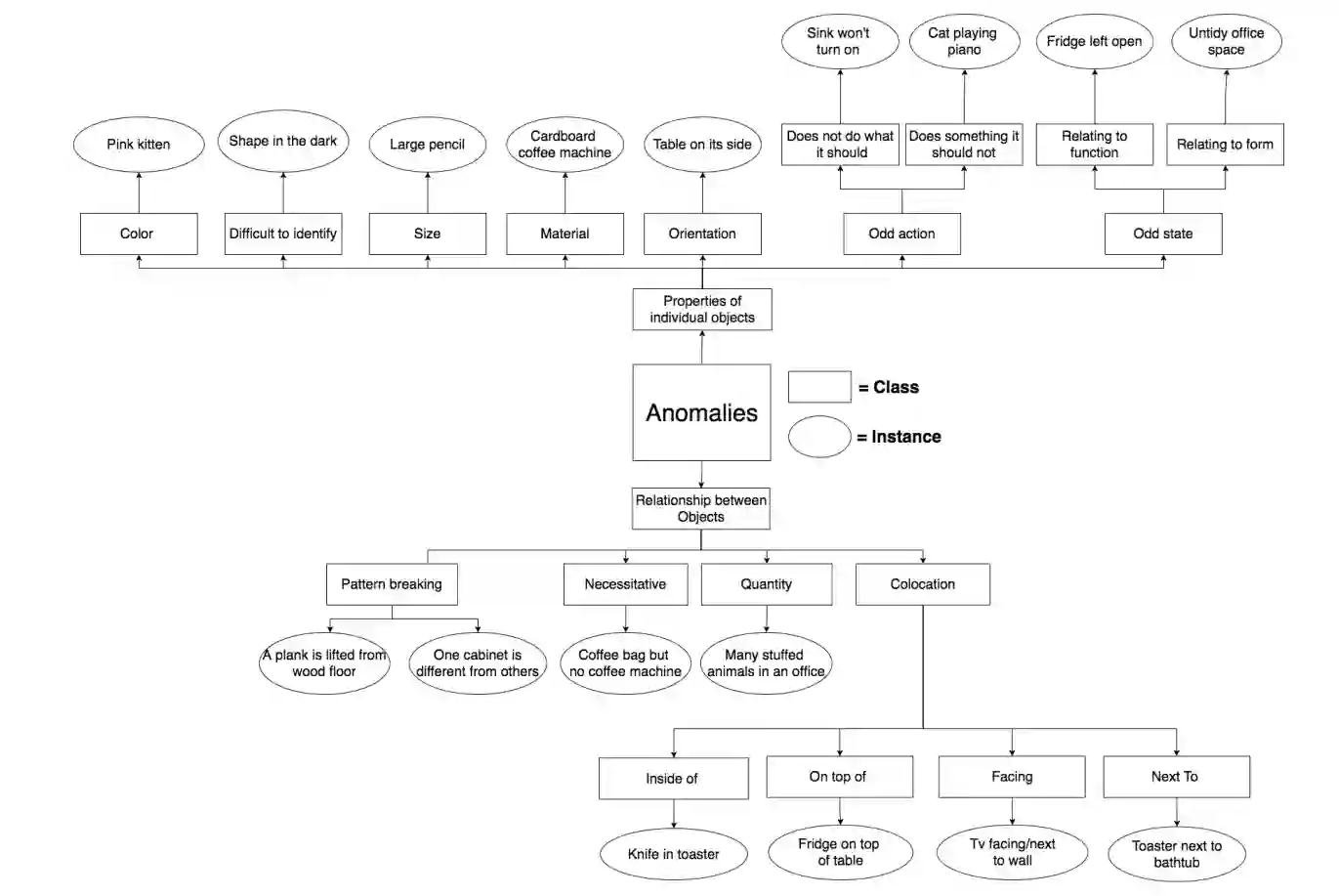 图 1. 带有实例的类异常分类法。矩形框中包含类的类型(如实体的 "颜色"),椭圆形是类属性的实例或示例(如 "粉色小猫")。