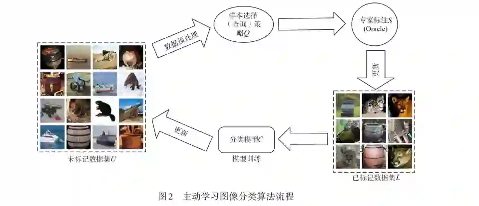 图像分类作为计算机视觉领域中的重要研究方向之一,应用领域非常广泛.基于深度学习的图像分类技术取得的成功,依赖大量的已标注数据,然而数据的标注成本往往是昂贵的.主动学习作为一种机器学习方法,旨在以尽可能少的高质量标注数据达到期望的模型性能,缓解监督学习任务中存在的标注成本高、标注信息难以大量获取的问题.主动学习图像分类算法根据样本选择策略,从未标记样本数据集合中选择出信息量丰富,对分类模型训练贡献更高的样本进行标注,以更新已标注训练数据池,如此循环直至满足给定的停止条件或模型标注预算耗尽.本文对近年来提出的主动学习图像分类算法进行了详细综述,并根据所用样本数据处理及模型优化方案,将现有算法分为三类:基于数据增强的算法,包括利用图像增广来扩充训练数据,或者根据图像特征插值后的差异性来选择高质量的训练数据;基于数据分布信息的算法,根据数据分布的特点来优化样本选择策略;优化模型预测的算法,包括优化获取和利用深度模型预测信息的方法、基于生成对抗网络和强化学习来优化预测模型的结构,以及基于Transformer结构提升模型预测性能,以确保模型预测结果的可靠性.此外,本文还对各类主动学习图像分类算法下的重要学术工作进行了实验对比,并对各算法在不同规模数据集上的性能和适应性进行了分析.另外,本文探讨了主动学习图像分类技术所面临的挑战,并指出了未来研究的方向. 图像分类是计算机视觉领域中的一大基本任务 . 图像分类任务的核心在于图像特征提取和分类器的设 计. 随着深度学习(Deep Learning,DL)[1] 技术的不断发 展,基于卷积神经网络(Convolutional Neural Networks, CNN)[2] 的图像特征提取技术取得了巨大的成就. 卷积 神经网络可以通过组合简单特征形成更复杂和抽象的 特征,从而提高图像分类任务的准确性和鲁棒性. 作为 一种数据表示学习的方法,深度学习可以通过迭代更 新深度网络层级参数来训练和优化模型,从而使结果 更加接近真实值 . 常用于图像分类的深度网络包括 LeNet[3],GoogLeNet[4],AlexNet[5],VGGNet[6],ResNet[7] 等. 然而,在图像分类领域,为了得到高精度的分类器, 深度学习模型很大程度上依赖大量已标注数据来优化 模型参数. 特别是在需要高水平专业知识的领域,如医 学图像[8] 、遥感图像[9] 等,获取大量的高质量已标注数 据集需要消耗大量的人力. 主动学习(Active Learning,AL)[10] 作为一种能够降 低样本标注成本的学习方法,正逐渐受到越来越多的 关注. 主动学习作为监督式机器学习中的一种范式,旨 在标注尽可能少的样本,同时最大化模型的性能增益. 具体来讲,主动学习根据样本选择策略从未标记的数 据集中选择信息丰富的样本,交由 Oracle 进行标注,以 降低模型所需数据量、计算资源和存储资源的需求,同 时保持分类器性能. Oracle是一个能够提供准确标签的 信息源,可以是人类专家或自动化系统. 样本选择策略 决定了算法选择哪些样本以获得最大的模型性能提 升 . 目前,主动学习已被应用于分类与检索[11] 、图像分 割[12] 、目标检测[13] 等多种图像处理任务.