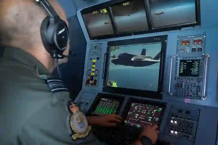 2022年“漆黑”演习期间,皇家空军“航行者”多用途加油运输机上的操作员与美国海军陆战队F-35B“闪电II”进行空中加油