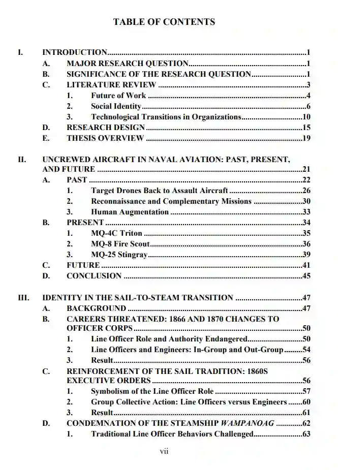 在从有机组人员的飞机向无机组人员的飞机过渡的过程中,海军航空部门把重点放在了技术方面,而不是人的方面。这一转变挑战了传统的飞行员身份,即基于坐在驾驶舱中实际操作飞机的身份,因为无机组人员飞机的飞行员是通过远程控制飞机或管理战场而不是驾驶舱。本论文使用身份理论和社会认同理论来分析19世纪海军从风帆到蒸汽动力的过渡中的类似文化因素,以确定一些直线军官如何以及为什么抵制和拒绝蒸汽技术,抑制了过渡。在这个案例研究中,海军领导层通过命令来鼓励抵制蒸汽动力,并且在工程师夺走了推进控制权并取代了与军官身份相关的符号时,未能引导军官身份的必要变化。为了避免重复这种失败,海军必须监督飞行员身份的转变,以便充分利用技术和人类的潜力。海军领导人应该强调团结,而不是制造分裂,创建一个包容性的飞行员身份,在提及飞机类别时使用不以人为主的术语,并为所有人创造可行的职业道路。