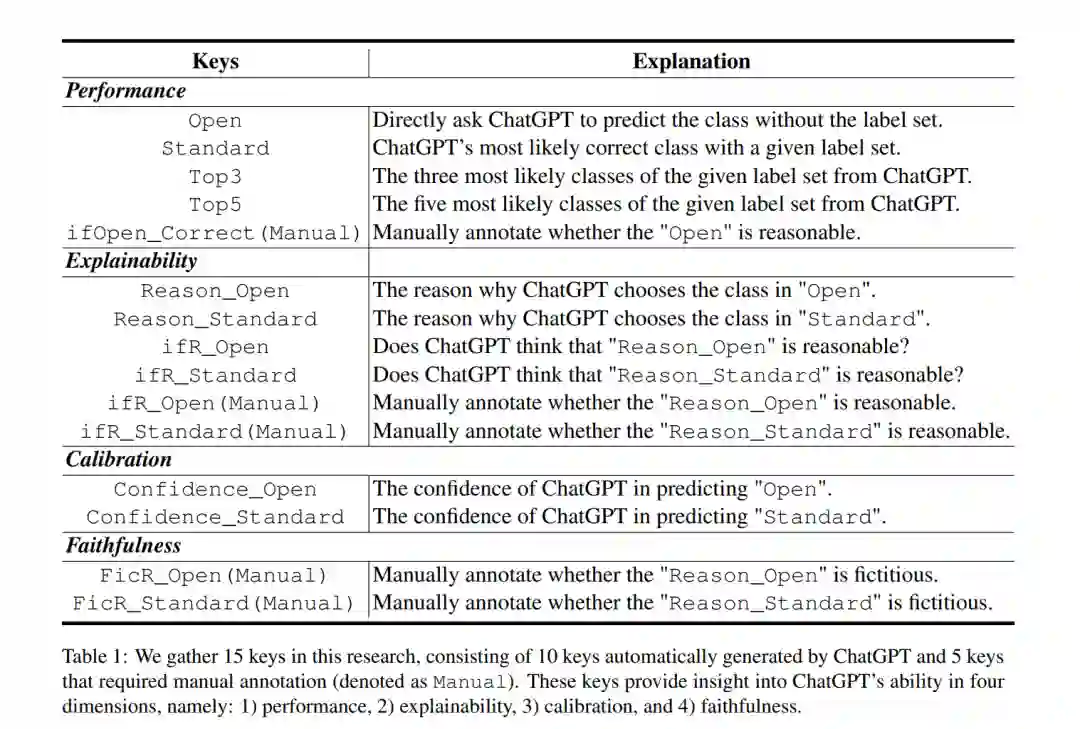 考虑到ChatGPT是一个封闭的模型,不提供关于其训练细节的信息,而且模型的任何回应都包含了观点。模型的回应可能会显著影响用户的体验,并在今后塑造他们的信仰(Aiyappa et al., 2023; Santurkar et al., 2023; Deshpande et al., 2023; Huang et al., 2023)。因此,评估ChatGPT不仅应涉及评估其实现高性能的能力,还应衡量其提供答案的可靠性。为了帮助用户更好地了解ChatGPT回应的整体质量,并使其能力的系统衡量成为可能,我们设计了以下四个度量维度:我们考虑的第一个维度是性能,它反映了ChatGPT在多个角度上处理各种信息提取任务的整体表现。第二个度量维度是可解释性(Explainability)(Rajani et al., 2019; Aghajanyan et al., 2021; Zini 和 Awad, 2023),评估ChatGPT是否能为其预测提供合理的理由,从而提供关于ChatGPT决策过程的洞察。第三个是校准(Calibration)(Guo et al., 2017; Kumar et al., 2019; Thulasidasan et al., 2019; Minderer et al., 2021),衡量模型预测不确定性,我们使用这个指标来评估ChatGPT在预测上是否过于自信。最后一个维度是忠实度(Faithfulness)(Maynez et al., 2020; Koto et al., 2022; Creswell 和 Shanahan, 2022; He et al., 2023),它经常用于摘要任务,以确定摘要是否准确反映了输入。在我们的研究中,我们采用忠实度作为衡量ChatGPT给出的解释是否真实反映输入,或者它们是否是伪造的。总之,根据以上四个维度,我们从ChatGPT或领域专家那里收集15个关键指标进行评估(§ 3)。