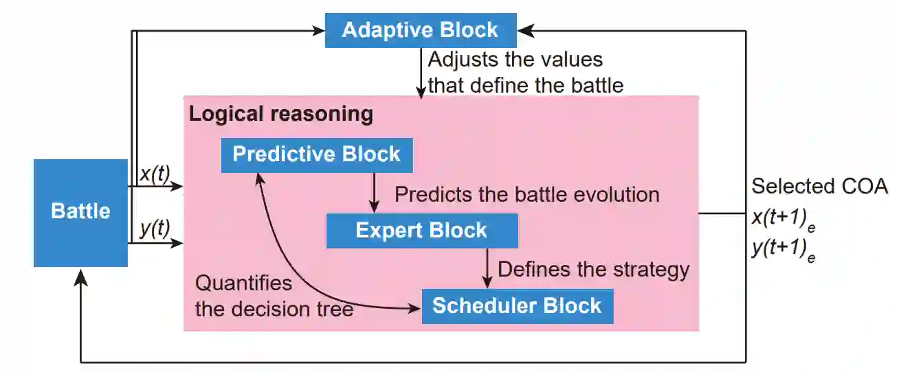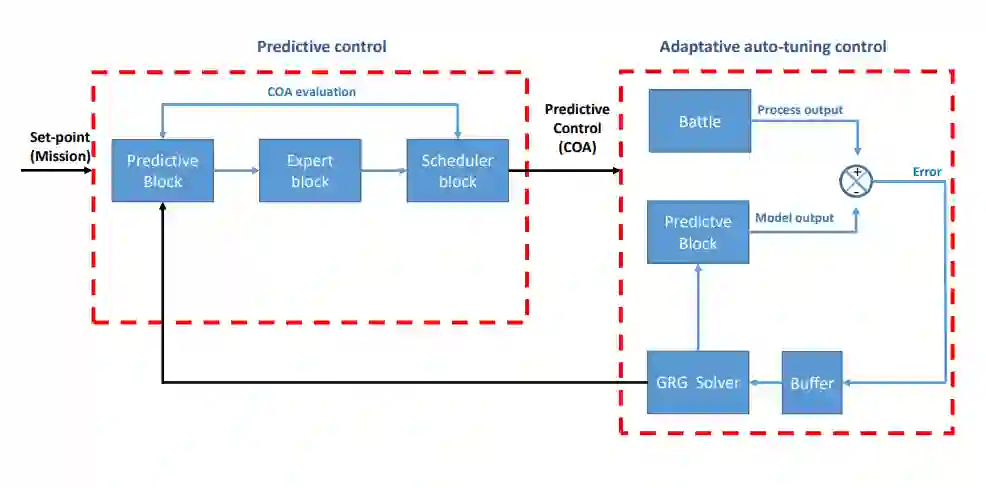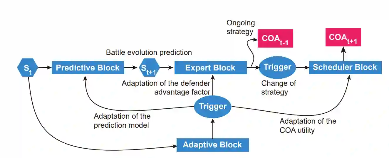 图3.2开发了迭代触发特定COA选择的基本要素。预测块产生预测演变。适应性模块根据输出信号(实际情况)与预测信号的差异调整组成模块的参数,并适当地更新最后执行的COA。专家区块试图通过调度区块修改预测区块定义的趋势,从而按照战斗的需要改变行动路线。值得注意的是,设定点与完成任务有关,行动的发展时间是操作时间,在最好的情况下,有冲突信息的可用数据库通常是以天为单位的时间演变。