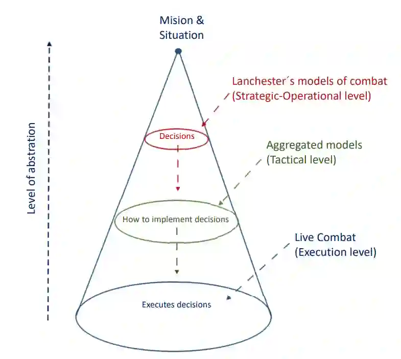 图3.3:纵轴标识了模型所体现的抽象程度,圆锥体的底圆代表现实或完全没有抽象,随着聚合水平的提高,定义指挥水平的变量逐渐抽象出作战执行的细节。因此,在兰彻斯特模型的应用水平与战略-战役聚合水平相一致,聚合模型涵盖了战斗最基本的执行机制,如个体冲突,执行水平受到武器装备、位置、能见度、后勤等因素的影响。