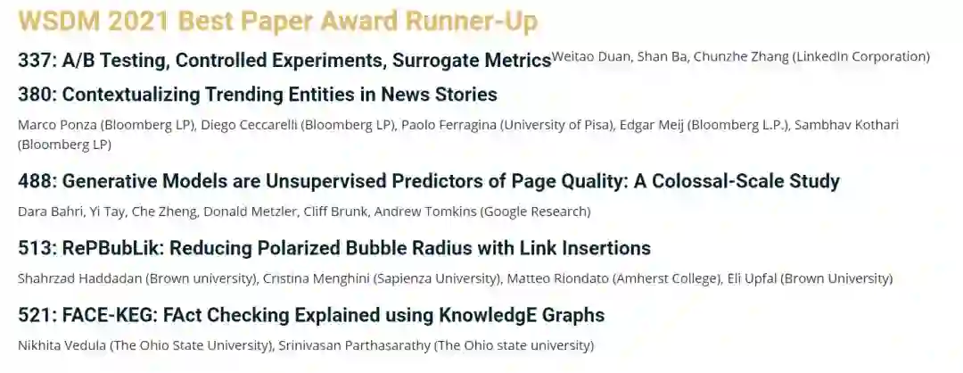 2021年第14届国际网络搜索与数据挖掘会议WSDM将在2021年3月8日到12日于线上举行。今年此次会议共收到了603份有效投稿,最终录取篇数为112篇,录取率为18.6%。近日大会公布了优秀论文奖项(WSDM 2021 Best Paper Award Runner-Up),共有5篇论文。