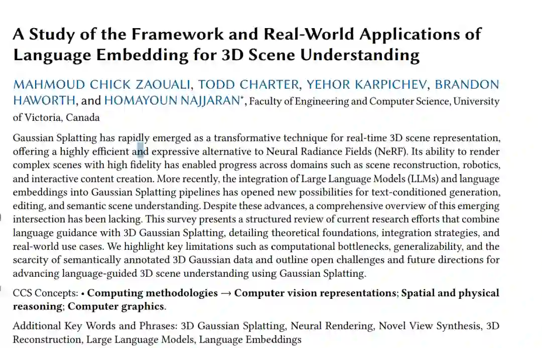 受机器人、自主导航与娱乐等应用的驱动,以及虚拟现实(VR)与增强现实(AR)中对沉浸式体验日益增长的需求,三维场景重建已成为计算机视觉与计算机图形学中的关键研究领域。近年来,新视图合成(Novel View Synthesis, NVS)技术取得了显著进展,其中两个方法在学术界获得了广泛关注:三维高斯喷溅(3D Gaussian Splatting, 3DGS)[76] 与神经辐射场(NeRF)[114]。 在 NeRF 出现之前,已有多种神经隐式表示方法验证了在连续函数空间中编码三维几何的可行性。Occupancy Networks [112] 和 DeepSDF [123] 分别于 2018 年和 2019 年提出,通过神经网络建模占据概率或符号距离场(Signed Distance Field, SDF)来表示三维形状。这些方法为后续体素化场景表示奠定了基础。 在此基础上,NeRF 通过将视角相关的辐射信息引入表示方式,实现了范式转变。它使用三维空间坐标(𝑥, 𝑦, 𝑧)表示空间点,并用两个角度坐标(𝜃, 𝜙)表示相对于场景的观察方向,从而利用深度全连接神经网络实现了隐式的三维场景编码。这种结构能够同时生成体积密度与视角相关的 RGB 颜色。尽管 NeRF 在渲染质量上表现出色,但其训练与推理时间较长,使其难以应用于实时场景 [120]。为缓解 NeRF 的性能瓶颈,InstantNGP [120] 在架构上进行了优化,实现了实时训练与渲染。然而,即便有这些改进,其依赖的隐式场景表示仍限制了重建的灵活性与可控性。 与之形成对比的是,Kerbl 等人 [76] 提出了三维高斯喷溅(3DGS)作为一种灵活、显式的场景表示方法。与许多早期基于 NeRF 的方法类似,它首先通过基于运动结构(Structure-from-Motion, SfM)[149] 估计相机位姿,并利用得到的稀疏点云初始化一组三维高斯分布。不同于依赖稠密多视图立体(Multi-View Stereo)重建的点云方法,3DGS 仅通过稀疏初始化即可实现高质量结果。随后,它优化可微分的体积表示,将每个高斯通过标准的 α 混合(alpha-blending)[114] 投影到二维,实现高效且真实感强的渲染。 与三维表示技术并行发展的,是大型语言模型(Large Language Models, LLMs)与视觉-语言模型(Vision-Language Models, VLMs)的兴起,它们重塑了计算机视觉与人工智能的格局。LLMs 在语言理解、生成、翻译与推理方面表现出卓越能力,能够作为从写作到编程等任务的“副驾驶”。与此同时,VLMs 通过实现开放词汇识别、零样本分类、分割与定位等任务,突破了以往封闭、类别特定训练的限制。这类视觉模型利用对齐的图像-文本表示,从而以更具泛化性和语义丰富度的方式理解与标注视觉内容。 在此基础上,多模态大型语言模型(Multimodal LLMs, MLLMs)进一步发展,可同时处理并推理语言、视觉与音频等多种数据模态,从而在一定程度上模拟人类的感知与交互能力。 然而,尽管 VLMs 与 MLLMs 已在二维感知任务上取得重大进展,将这些能力拓展到三维仍是一大挑战。现实世界本质上是三维的,要在三维中实现空间推理、物体交互与场景级理解,需要保证几何一致性、多视图对齐以及精确的相机估计——这些问题并非二维模型所能直接解决。将二维知识直接投射到三维空间,往往会引入歧义,并丢失结构与语义上的准确性。对于未来需要与真实环境交互的具身智能(Embodied AI)系统而言,从场景布局到细粒度物体语义的深度与结构化三维理解是必不可少的,单纯依赖二维视觉会限制这一潜力。与此同时,VLMs 与 MLLMs 所具备的世界知识、组合推理与泛化能力,如果能被恰当地引入三维任务,将显著提升三维场景理解效果。 随着三维高斯喷溅迅速成为照片级真实感与实时三维场景表示的新标准,以及基础模型逐步融入三维处理流程,我们认为有必要对这一新兴交叉领域进行系统性回顾。尤其是,越来越多的研究开始探索将 VLMs 与 LLMs 引入三维场景表示,以应对语义场景理解、视觉-语言对齐、自动标注与交互等任务 [35, 105, 182]。然而,迄今尚无工作对语言嵌入与 3DGS 的结合进行全面探讨。我们的目标是首次对这一快速发展的方向提供深入的研究视角。 本文采用教程式结构,旨在引导读者理解并评估将语言嵌入整合进三维场景理解的关键组成部分。我们首先介绍三维高斯喷溅这一实时三维场景表示的最新方法,解析其核心流程,并与基于 NeRF 的技术加以区分。接着,回顾语言嵌入方法的发展历程,从早期的词嵌入到现代的 LLMs 与 VLMs。在此基础上,我们探讨语言模型如何与 3DGS 结合,以应对复杂的场景理解任务。全文还将结合真实应用案例,讨论当前的局限性,并指出开放的研究方向,以期为该新兴领域的未来发展提供启发与指导。 三维高斯喷溅(3D Gaussian Splatting, 3DGS)已成为一种高效且灵活的实时三维场景表示与渲染方法。与依赖计算量巨大的体素光线行进(volumetric ray marching)的基于体积的神经表示(如 NeRF)不同,3DGS 使用一组参数化的三维高斯分布来表示场景。每个高斯由其空间位置、不透明度、形状(各向异性协方差)以及颜色信息定义,从而形成一种显式且可微分的表示,可实现高效光栅化 [76]。 该方法建立在传统的基于运动结构(Structure-from-Motion, SfM)技术之上,通过 SfM 相机标定生成的点云初始化稀疏的三维高斯集合。不同于许多依赖稠密多视图立体(Multi-View Stereo, MVS)重建的点云方法,高斯喷溅仅使用稀疏点云作为输入即可生成高质量的新视图合成。其流程如图 1 所示。