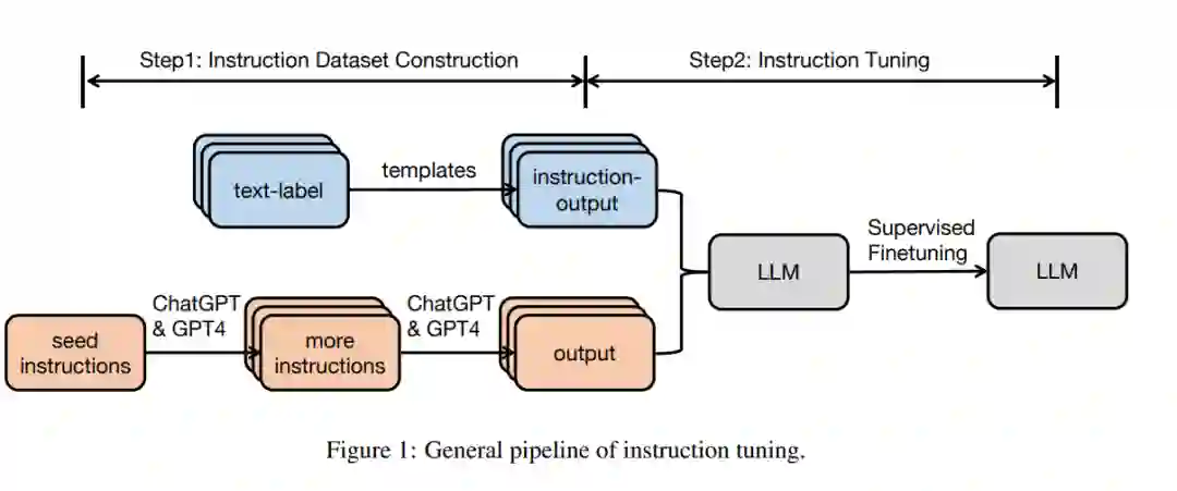为了解决这种不匹配,提出了指令调优(IT)作为一种有效的技术,用于增强大型语言模型的能力和可控性。它涉及进一步使用(指令,输出)对来训练LLMs,其中指令表示模型的人类指令,而输出表示遵循指令的期望输出。指令调优的好处有三个:(1)在指令数据集上微调LLMs弥合了LLMs的下一个词预测目标与用户遵循指令目标之间的差距;(2)与标准LLMs相比,指令调优可以实现更可控且更可预测的模型行为。指令有助于约束模型的输出,使其与期望的响应特性或领域知识保持一致,为人类提供介入模型行为的途径;以及(3)指令调优在计算上效率高,可以使LLMs在不需要大规模重新训练或架构更改的情况下快速适应特定领域。