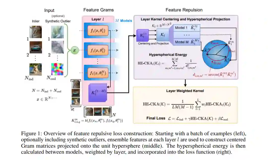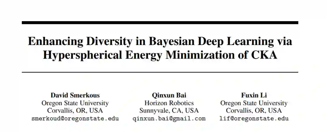 基于粒子的贝叶斯深度学习通常需要相似性度量来比较两个网络。然而,简单的相似性度量缺乏置换不变性,不适合用于网络比较。提出了基于特征核的中心核对齐(CKA)用于比较深度网络,但在贝叶斯深度学习中尚未作为优化目标使用。在本文中,我们探索了在贝叶斯深度学习中使用 CKA 来生成多样化的集成和输出网络后验的超网络。我们注意到 CKA 将核投影到单位超球面上,而直接优化 CKA 目标在两个网络非常相似时会导致梯度衰减。为了解决这一缺陷并提高训练稳定性,我们提出在 CKA 核的基础上采用超球面能量(HE)的方法。此外,通过利用基于 CKA 的特征核,我们推导出施加于合成生成的异常值示例的特征排斥项。在多样化集成和超网络的实验中,我们的方法在合成和实际异常检测任务中显著优于基线方法,尤其在不确定性量化方面。