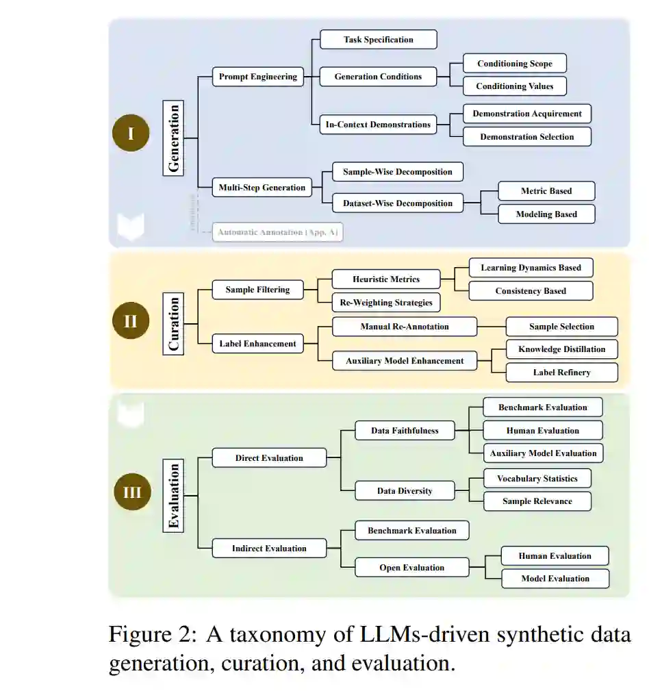 尽管看似简单,但生成同时具有高正确性和足够多样性的合成数据集需要精心设计过程,并涉及许多技巧(Gandhi et al., 2024),使得LLMs驱动的合成数据生成成为一个非平凡的问题。虽然大多数现有工作通常针对各种任务(如预训练(Gunasekar et al., 2023; Li et al., 2023b; Eldan and Li, 2023)、微调(Mukherjee et al., 2023; Mitra et al., 2023; Xu et al., 2023a)、评估(Feng et al., 2023; Wei et al., 2024))和不同领域(如数学(Yu et al., 2023a; Luo et al., 2023a)、代码(Luo et al., 2023b; Wei et al., 2023b)、指令(Honovich et al., 2023a; Wang et al., 2023d))进行数据生成,但它们共享许多共同的理念。为了应对LLMs驱动的合成数据生成这一新兴领域中缺乏统一框架的问题,并开发通用工作流程,本综述调查了最近的研究,并根据生成、策展和评估三个密切相关的主题进行组织,如图2所示。我们的主要目的是提供该领域的全面概述,确定关键关注领域,并突出需要解决的空白。我们希望为学术界和工业界带来见解,并推动LLMs驱动的合成数据生成的进一步发展。