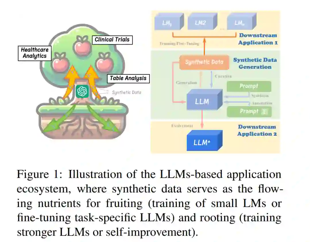 鉴于LLMs的最新进展,它们展示了生成与人类输出相当的流畅文本的能力(Hartvigsen et al., 2022; Sahu et al., 2022; Ye et al., 2022a; Tang et al., 2023; Gao et al., 2023a),由LLMs生成的合成数据成为了人类生成数据的一种可行替代品或补充。具体来说,合成数据旨在模仿真实世界数据的特征和模式(Liu et al., 2024)。一方面,LLMs通过广泛的预训练,积累了丰富的知识库,并展现出卓越的语言理解能力(Kim et al., 2022; Ding et al., 2023a),这为生成真实的数据奠定了基础。另一方面,LLMs深厚的指令遵循能力允许在生成过程中实现更好的可控性和适应性,从而能够为特定应用创建定制的数据集,并设计更灵活的流程(Eldan and Li, 2023)。这两个优势使LLMs成为极具前景的合成数据生成器。