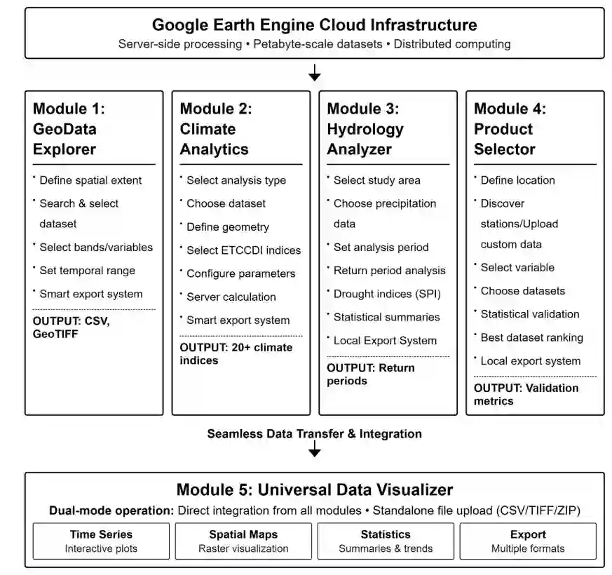 环境科学教育面临一个关键障碍:编程要求阻碍了学生、新手研究人员和领域专家获取行星尺度的数据集。本研究介绍了地理气候智能平台,这是一个基于网络的框架,由谷歌地球引擎提供支持,在保持研究级分析能力的同时消除了编程障碍。该平台由五个集成模块组成:用于访问气候数据集的地理数据浏览器,实现20多个符合ETCCDI标准的气候指数的气候分析模块,用于降水分析和重现期计算的水文分析模块,用于数据集验证的产品选择器,以及用于交互式分析的数据可视化模块。这种模块化设计支持集成化工作流,同时保持各专门功能间的分析独立性。开发动机源于系列研讨会,会上学生发现尽管动力很强,但编程障碍难以逾越。通过大学课程进行的教育验证证明了其有效性。性能评估显示其在从教育到研究规模的应用中具有良好的可扩展性。该平台仅需要一个谷歌地球引擎账户并通过网络浏览器运行,无需安装软件。这种可及性变革使得更多人能以科学严谨性参与数据驱动的环境问题解决,为教育和研究界民主化了复杂的环境分析。