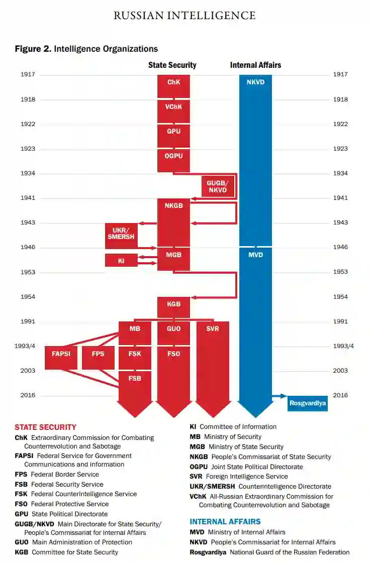 第10章也是最后一章对俄罗斯情报部门的未来进行了假设,用公式分析了俄罗斯情报部门:威胁=意图x能力x机会。 俄罗斯情报部门既有优势也有挑战,这将影响其未来收集和秘密行动任务的执行,进而影响其构成的威胁。包括弗拉基米尔-普京在内的俄罗斯情报部门领导人公开将俄罗斯情报部门描绘成无坚不摧和不可阻挡的,而当全世界都鹦鹉学舌时,俄罗斯情报部门也会从中受益。对俄罗斯情报部门进行平衡、现实的分析,可以防止将其从业人员视为 "身高10英尺、刀枪不入 "的倾向,同时认识到他们对目标国家的国家安全构成的真正威胁。