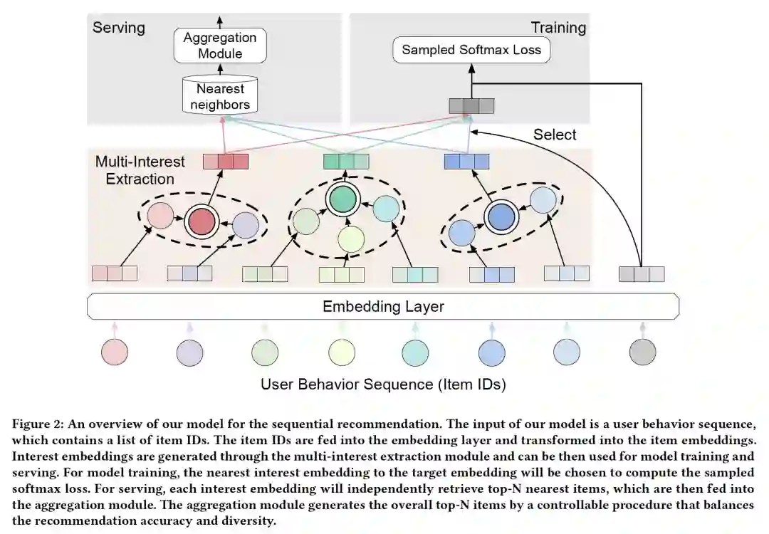 摘要:近年来,由于深度学习的快速发展,神经网络在电子商务推荐系统中得到了广泛的应用。我们将推荐系统形式化为一个序列推荐问题,目的是预测可能与用户交互的下一个项目。最近的研究通常从用户的行为序列中给出一个整体的嵌入。然而,统一的用户嵌入不能反映用户在一段时间内的多个兴趣。本文提出了一种新颖的可控多兴趣序列推荐框架,称为ComiRec。我们的多兴趣模块从用户行为序列中捕获多个兴趣,可用于从大规模项目集中检索候选项目。然后将这些项目送入聚合模块以获得总体推荐。聚合模块利用一个可控因素来平衡推荐的准确性和多样性。我们在两个真实的数据集Amazon和Taobao进行序列推荐实验。实验结果表明,我们的框架相对于最新模型取得了重大改进。我们的框架也已成功部署在离线阿里巴巴分布式云平台上。
