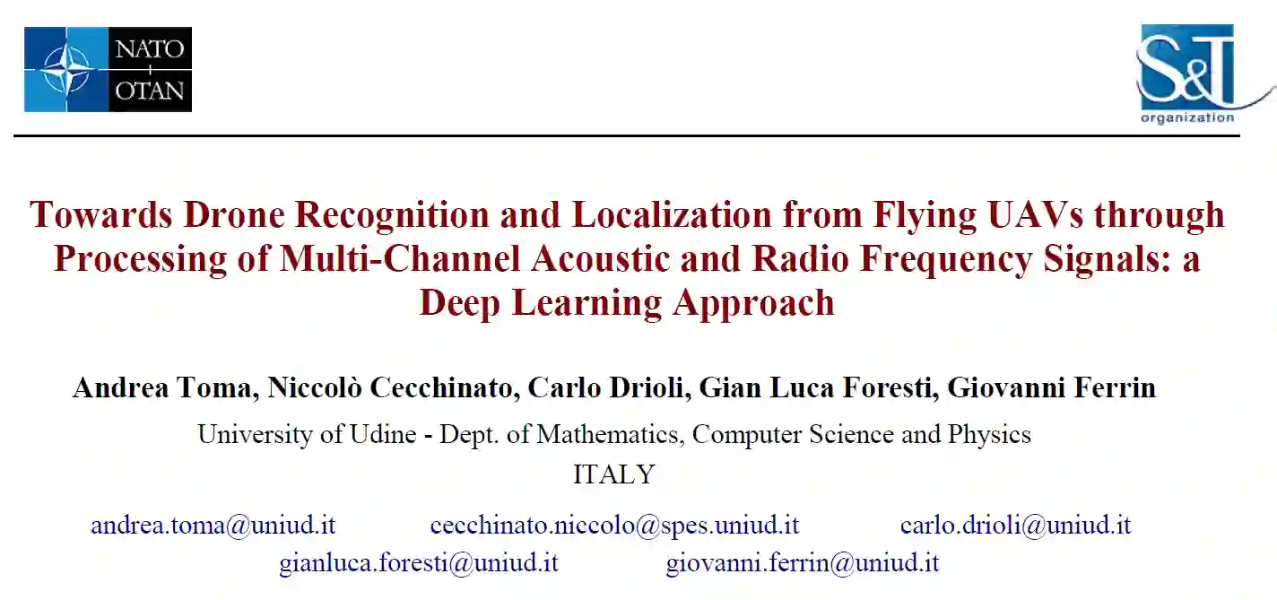 我们解决的问题是检测作为声源的不明无人机的存在,通过处理螺旋桨噪声产生的声学信号在不同的无人机中识别它,并通过估计声学信号的到达方向(DOA)和与无人机的距离对无人机进行定位。我们提出了一个解决方案,其中声学处理得到了射频(RF)传输模式分析的帮助。这样,当声学定位前端检测到来自射频天线组件估计方向的声学活动时,声源定位可以得到完善,并通过波束成形增强记录信号。这是因为,当使用安装在多旋翼无人机(UAV)上的小尺寸麦克风阵列进行声学记录时,如[1,2,3],由于对麦克风阵列尺寸的限制,可能导致信号-噪声增强不佳、空间分辨率低和空间信息不完整等问题,对感兴趣的声源的处理和信号增强变得特别具有挑战性。为了解决这些限制,最近在[4,5]中介绍了一种新的基于射频的声源定位处理方法,该方法也能进行距离估计,但没有引入识别能力。因此,我们现在研究射频辅助算法的性能,该算法也能识别未识别的空中声源。我们的算法可以应用于针对非法使用无人机和外部无人机攻击的反无人机监测策略[6,7],即使是在敌对环境中。