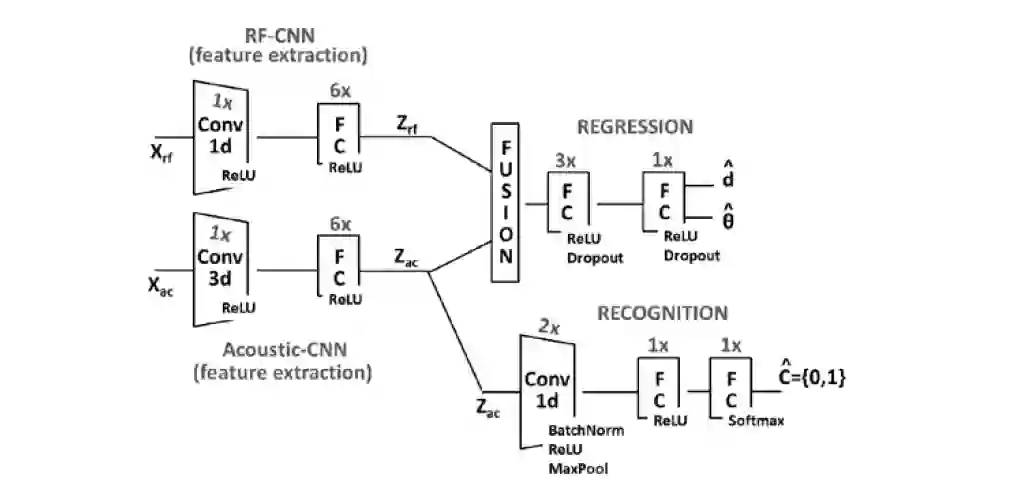 最近,深度学习(DL)和深度神经网络(DNN)研究领域的发展所带来的计算和性能上的进步,促进了文献中无人机识别算法的增加,如[8,9,10]。特别是,已经证明主要由螺旋桨、马达和机体的机械振动产生的综合声学信号具有足够独特的特征,可以用来在现实的开放世界条件下在一些无人机类别中识别无人机类型。DL和DNN也被研究用于涉及多通道声学处理的各种应用,如[11,12]和[13]中,多通道频谱相位信息被用作卷积神经网络(CNN)的输入,用于DOA估计。在我们的研究中,一个基于CNN的四级网络的算法的性能被引入到识别和定位任务中。两个平行阶段处理射频数据和声学数据的内在特征。第三阶段进行声源识别,第四阶段进行回归。这种算法既能产生无人机识别,又能对DOA和与声源的距离进行联合预测。本文对这一研究的现状进行了讨论。