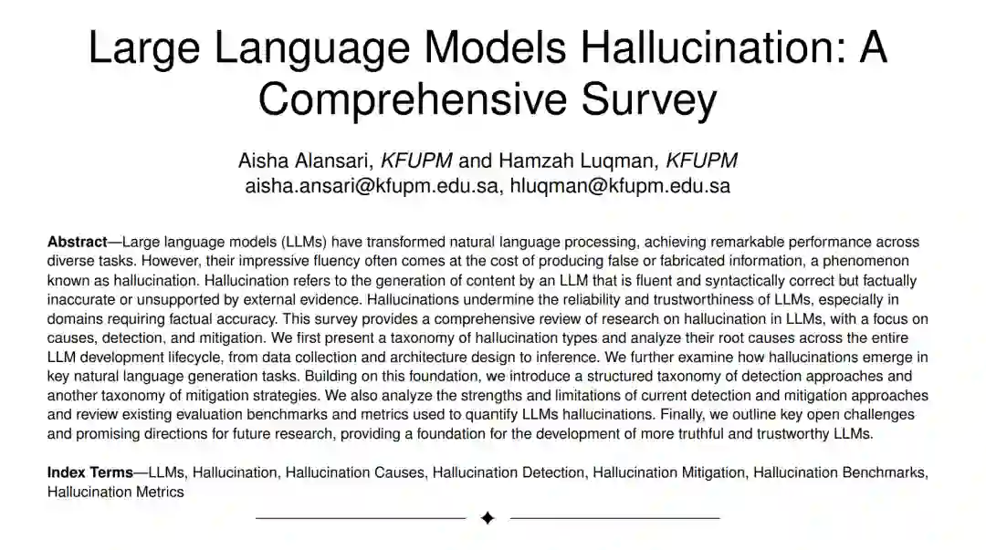 摘要——大型语言模型(Large Language Models, LLMs)已经彻底变革了自然语言处理领域,在多种任务上取得了显著性能。然而,这种令人印象深刻的流畅性往往以生成虚假或捏造的信息为代价,这一现象被称为幻觉(hallucination)。所谓幻觉,是指LLM生成的内容虽然流畅且语法正确,但在事实层面上不准确或缺乏外部证据支撑。幻觉削弱了LLM的可靠性与可信度,尤其在那些对事实准确性要求较高的应用领域中影响尤为严重。 本综述系统梳理了LLM幻觉相关研究,重点关注其成因、检测与缓解。我们首先提出了幻觉类型的分类体系,并从数据收集、模型架构设计到推理阶段,分析了幻觉在LLM全生命周期中的根本成因。接着,我们探讨了幻觉在关键自然语言生成任务中的表现机制。在此基础上,我们分别构建了幻觉检测方法与幻觉缓解策略的系统分类框架,并分析了现有方法的优势与局限。同时,我们回顾了用于量化LLM幻觉的评测基准与指标体系。最后,我们总结了当前研究的主要挑战,并展望了未来可能的研究方向,为构建更加真实、可信的大语言模型提供理论与方法基础。 关键词——大语言模型;幻觉;幻觉成因;幻觉检测;幻觉缓解;幻觉基准;幻觉指标