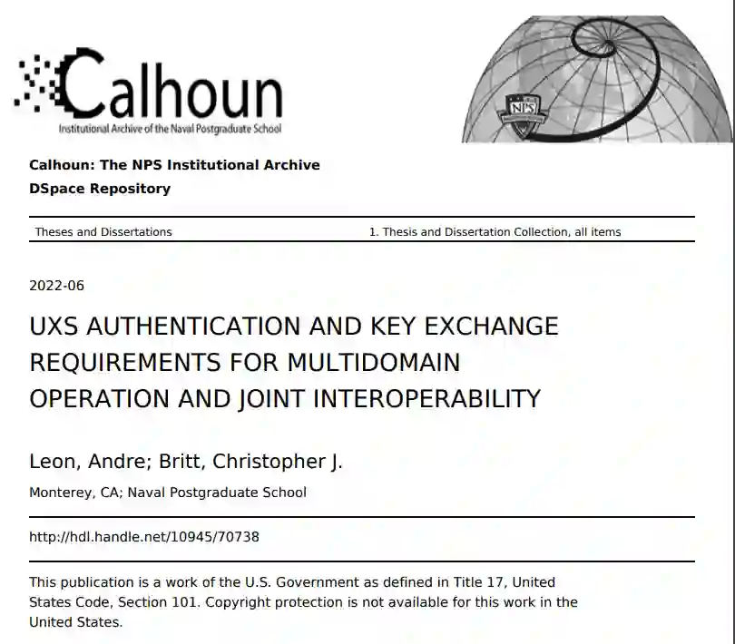 在联合全域指挥与控制(C2)传感器网络和美海军的 "超配项目"中,无人系统(UxS)是一种共享能力,它扩展了军事力量的范围和能力,以加强在有争议空间的战术。这增加了对可互操作的网络框架的研究,以安全和有效地控制分布式无人系统部队。迄今为止,陈旧的技术、分离和专有的商业惯例限制或掩盖了对新兴产业技术的追求,这些技术提供了当今现代化部队所需的安全功能,留下了更多的问题而不是事实。此外,UxS的功率和处理限制以及受限的操作环境禁止使用现有的现代通信协议。然而,消息层安全(MLS)的发展,一种安全和高效的团体通信协议,可能是UxS团队的理想选择。这篇论文记录了从一项定性研究中收集到的结果,发现MLS是UxS小组安全和效率的最佳选择。它还记录了MLS与ScanEagle无人机(UAV)和海军信息战太平洋CASSMIR无人水面艇(USV)的整合。该实施方案提供了一个作战概念,以证明使用MLS在多域特设网络配置中为无人机和USV之间提供安全和高效的C2和数据交换。所进行的实验是在一个虚拟环境和物理UxS中进行的。