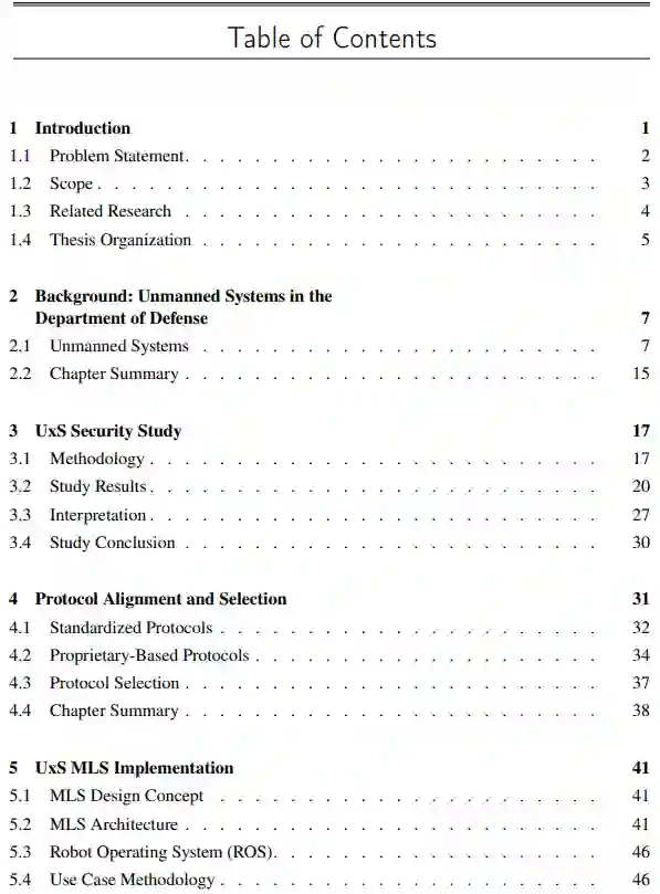 UxS的研究空间是巨大和不断发展的。正如本节所讨论的,UxS安全的主题已经在各个研究领域得到了研究和记录。然而,将不同的协议与军事要求进行比较,以制定C2协议标准,提高安全性、效率和互操作性的研究有限。尽管如此,选定的先前研究提供了与我们的研究有关或支持我们研究的见解。