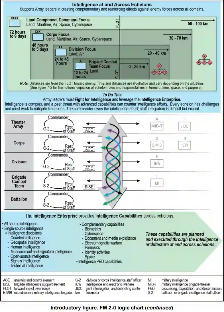 情报工作必须涵盖整个作战任务。情报专业人员必须了解陆地、海洋、空中、太空和网络空间领域,以及人、信息和物理层面,才能发挥有效作用。这种程度的了解对于指挥官在武装冲突、危机和武装冲突以下的竞争中实现可视化和决策至关重要。指挥官推动情报作战职能。指挥官和参谋人员不断运用和维持情报能力,必要时转移情报支持,以完成任务。G-2/S-2 是情报作战职能专家,就情报能力、力量、授权、人员整合、认证、培训和使用向指挥官提供建议。有效的情报工作需要指挥官、G-2/S-2、参谋部和支援情报单位指挥官之间的协作。
