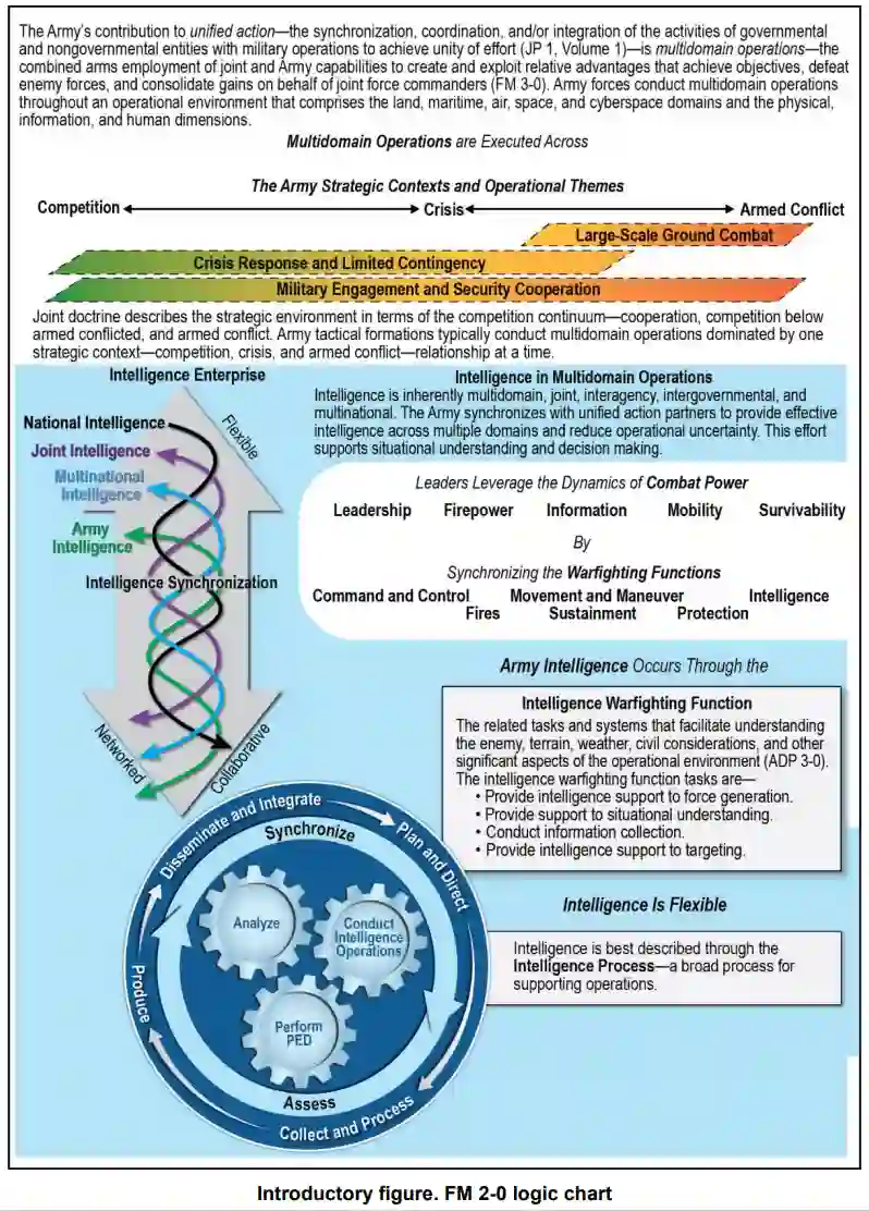 FM 2-0 逻辑图如下。它说明了与多域作战情报支持相关的 "为什么"、"谁"、"做什么"、"在哪里 "和 "如何做 "等首要问题。本出版物的每一章都建立在前几章的基础之上。FM 2-0 讨论了情报支持的许多方面,包括指挥官和参谋人员在情报工作中的作用、情报参谋人员的活动以及军情单位如何开展情报行动作为信息收集的一部分。最后两章讨论了一个关键主题:为情报而战--就不合作和已确定的威胁提供情报的斗争。