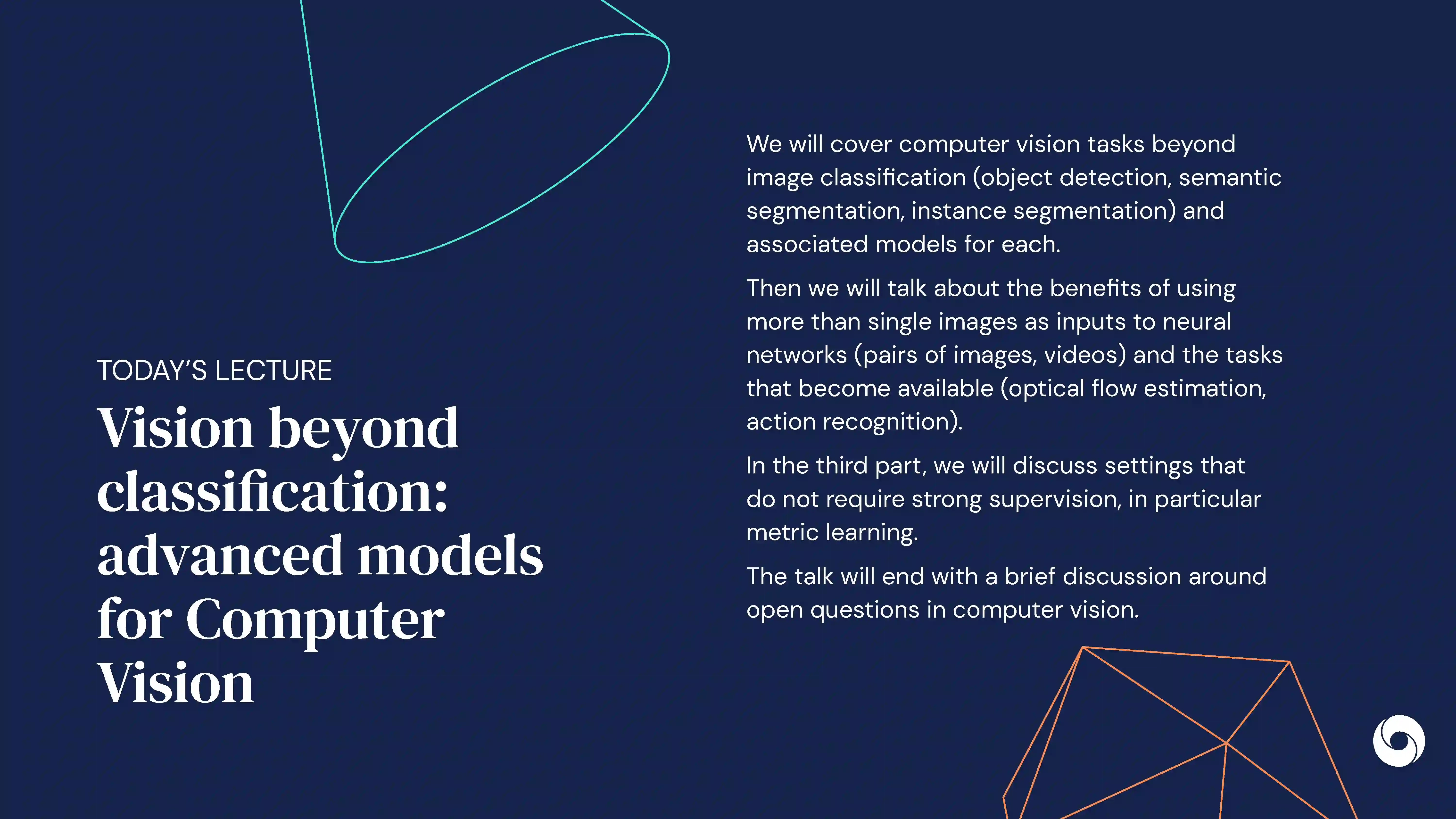 继上一讲之后,DeepMind研究科学家Viorica Patraucean介绍了图像分类之外的经典计算机视觉任务(目标检测、语义分割、光流估计),并描述了每种任务的最新模型以及标准基准。她讨论了视频处理任务的类似模型,如动作识别、跟踪和相关挑战。她特别提到了最近提高视频处理效率的工作,包括使用强化学习的元素。接下来,她介绍了单模态和多模态(vision+audio, visio+language)自监督学习的各种设置,在这些设置中,大规模学习是有益的。最后,Viorica讨论了视觉中的开放问题,以及计算机视觉研究在构建智能代理这一更广泛目标中的作用。