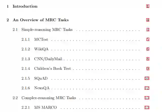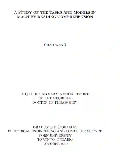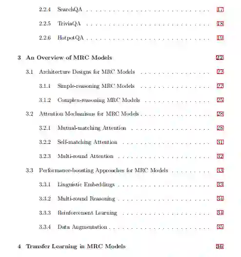 为了提供对机器阅读理解(MRC)中现有任务和模型的调查,本报告回顾:1)一些具有代表性的简单推理和复杂推理MRC任务的数据集收集和性能评估; 2)用于开发基于神经网络的MRC模型的体系结构设计,注意机制和提高性能的方法; 3)最近提出了一些转移学习方法,以将外部语料库中包含的文本样式知识合并到MRC模型的神经网络中; 4)最近提出的一些知识库编码方法,用于将外部知识库中包含的图形样式知识合并到MRC模型的神经网络中。 此外,根据已经取得的成就和仍然存在的不足,本报告还提出了一些尚待进一步研究的问题。