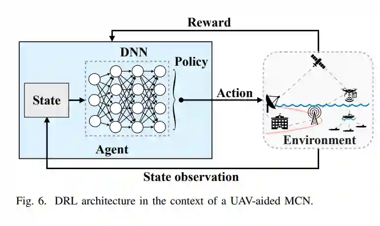 无人机辅助MCNs的自主运行对于为船舶和无人船提供无线覆盖,或用于边缘计算和缓存至关重要。无人机蜂群的自组织形成需要可靠的无人机间连接和分布式智能,无人机交换关于其速度和轨迹的数据,以避免碰撞并最大化覆盖和任务卸载能力[147]。然而,无线通信可能会面临数据交换延迟、信道质量下降、能量受限以及恶劣的气象条件影响无人机稳定性等问题。在这种背景下,基于ml的算法(如通过bandit信道预测)可以缓解过时的信道状态获取[48]问题,而针对无人机蜂群的WPT解决方案可以缓解能量限制的影响。