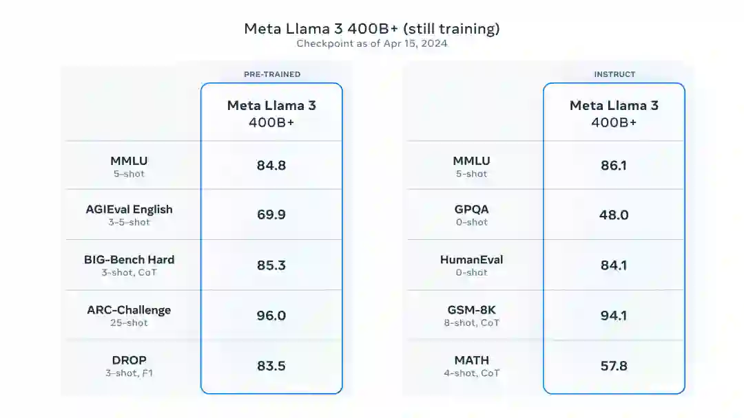 另外,Meta表示,最大的Llama-3仍在训练中,其参数超过400B,并在多项基准测试中取得了出色的成绩。一旦完成训练,Meta将发表一篇详细的研究论文。