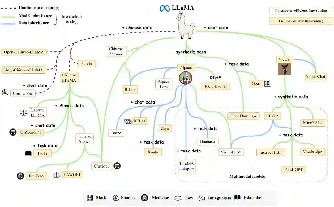 Llama-1 [1]是Meta在2023年2月发布的大语言模型,是当时性能非常出色的开源模型之一,有7B、13B、30B和65B四个参数量版本。Llama-1各个参数量版本都在超过1T token的语料上进行了预训训练,其中,最大的65B参数的模型在2,048张A100 80G GPU上训练了近21天,并在大多数基准测试中超越了具有175B参数的GPT-3。 由于模型开源且性能优异,Llama迅速成为了开源社区中最受欢迎的大模型之一,以Llama为核心的生态圈也由此崛起。我们将在第6节对这一生态进行详细介绍。与此同时,众多研究者将其作为基座模型,进行了继续预训练或者微调,衍生出了众多变体模型(见下图),极大地推动了大模型领域的研究进展。