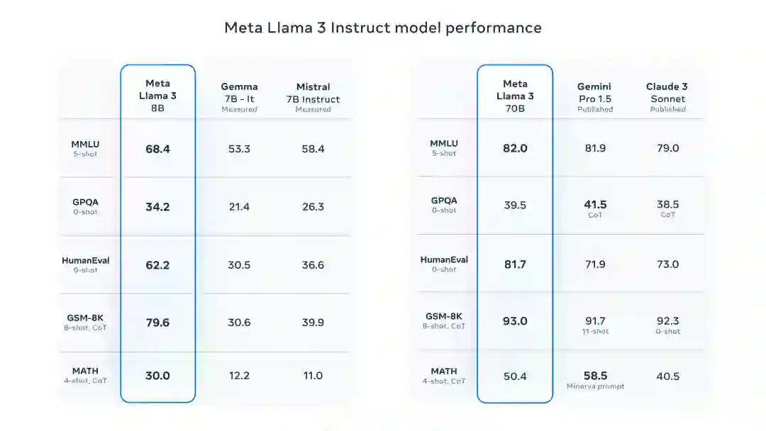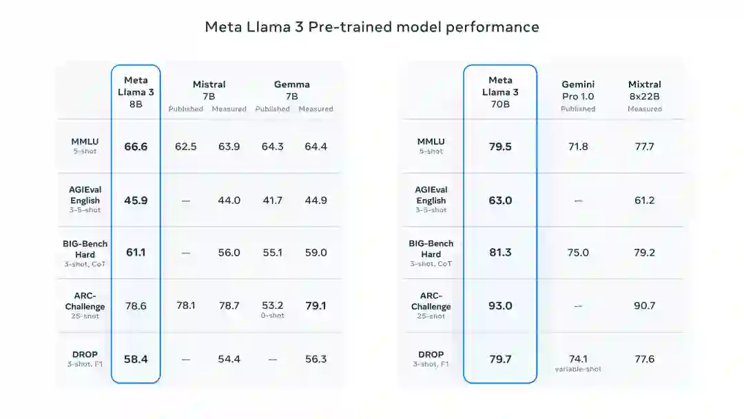 Llama-3之所以能够取得如此出色的成绩,离不开它预训练模型的优异性能。在众多基准测试中,8B模型超越了Mistral 7B和Gemma 7B,70B模型则战胜了Gemini Pro 1.0和Mixtral 8x22B。