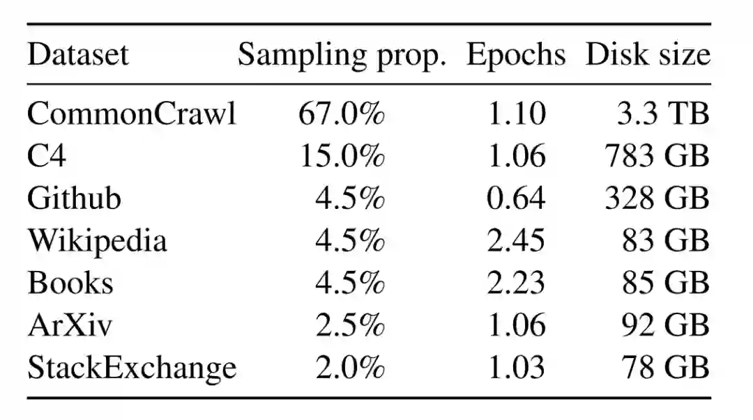 Llama-1使用了海量无标注数据进行自监督学习,这些预训练数据由多个来源混合而成,且都是公开的数据。各个来源的数据量和采样比例见下表。