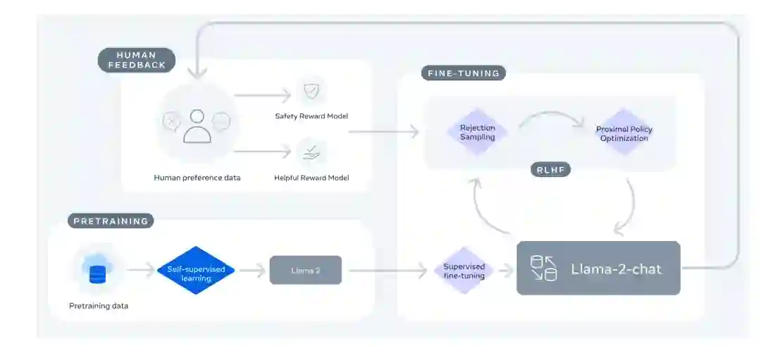 Llama-2模型是在Llama-1的基础上进一步发展的,而Llama-2-Chat模型则是基于Llama-2进行微调的版本。这两个模型保持了固定的4k上下文长度,这与OpenAI的GPT-4在微调过程中可能增加的上下文长度不同。 在Llama-2和Llama-2-Chat的微调中,采用了自回归损失函数,这是一种在生成模型中常见的方法,模型预测下一个token时会考虑到之前的所有token。在训练过程中,用户输入提示的token损失被清零,这意味着模型被训练以忽略这些特定的token,从而更专注于生成回复。 Llama-2-Chat的训练过程如下图所示。整个过程起始于利用公开数据对Llama-2进行预训练。在此之后,通过有监督微调创建了Llama-2-Chat的初始版本。随后,使用基于人类反馈的强化学习(RLHF)方法来迭代地改进模型,具体包括拒绝采样(Rejection Sampling)和近端策略优化(Proximal Policy Optimization, PPO)。在RLHF阶段,人类偏好数据也在并行迭代,以保持奖励模型的更新。