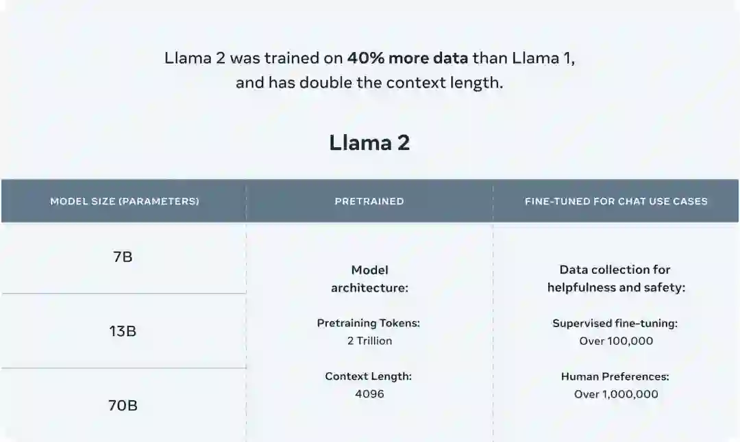 时隔5个月,Meta在2023年7月发布了免费可商用版本 Llama-2 [2],有7B、13B、34B和70B四个参数量版本,除了34B模型外,其他均已开源。